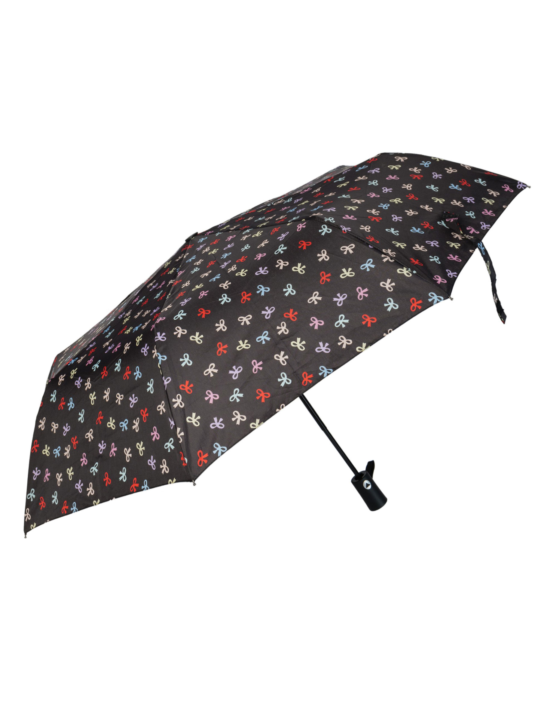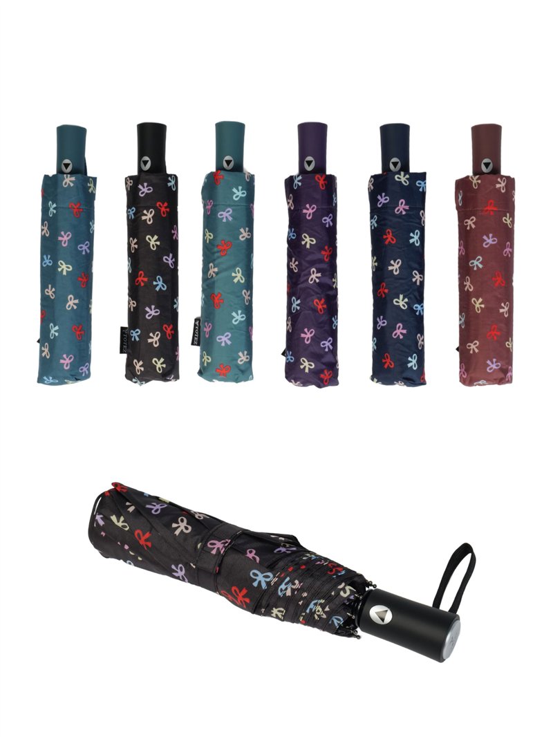 Paraguas plegable lazos. Tela PG. Antiviento. Automático. 8 Varillas de fibra. Mango de goma. Estructura de metal. 3 secciones. Colores surtidos.