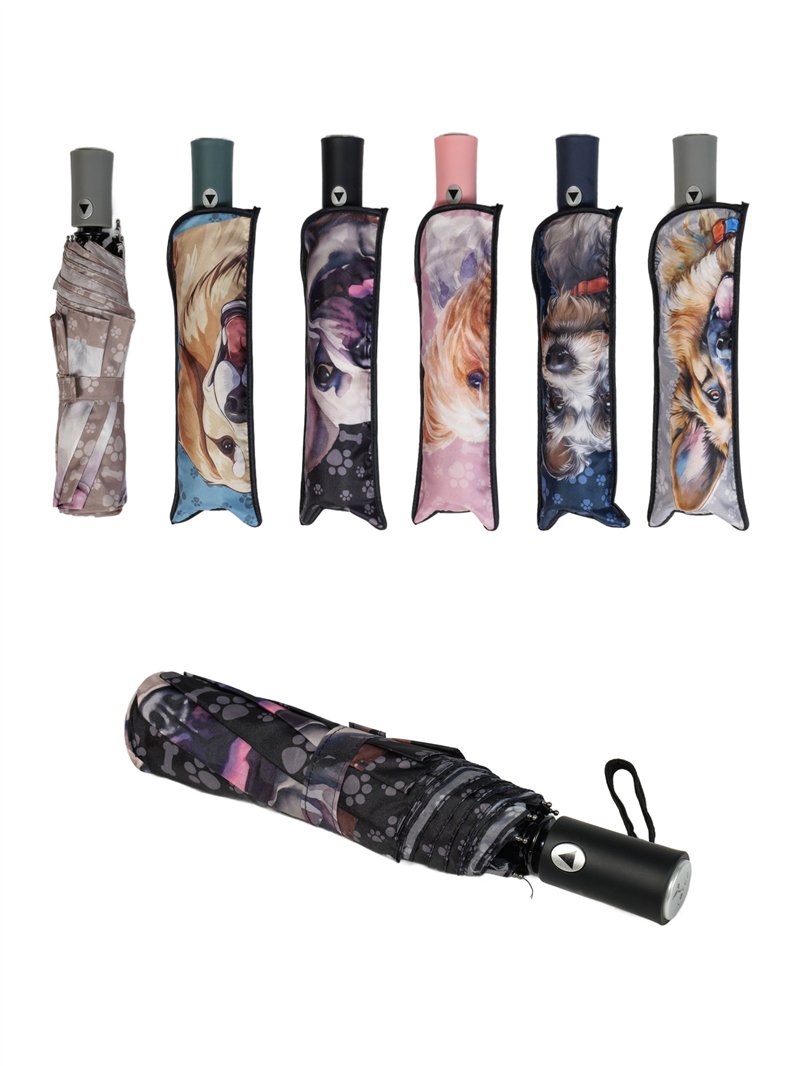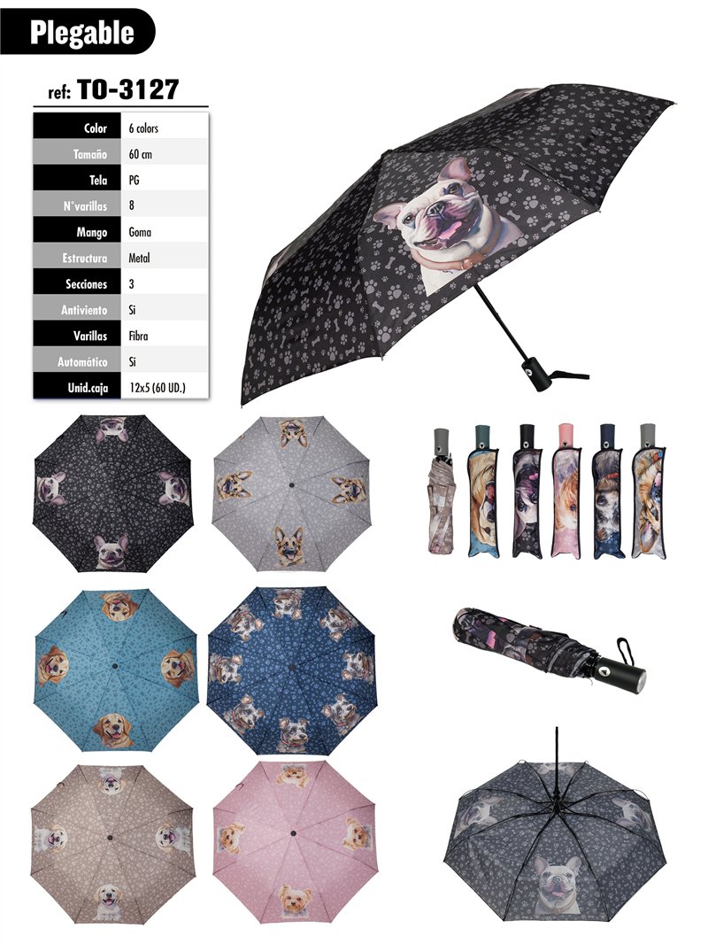 Paraguas plegable perritos. Tela PG. Antiviento. Automático. 8 Varillas de fibra. Mango de goma. Estructura de metal. 3 secciones. Colores surtidos.