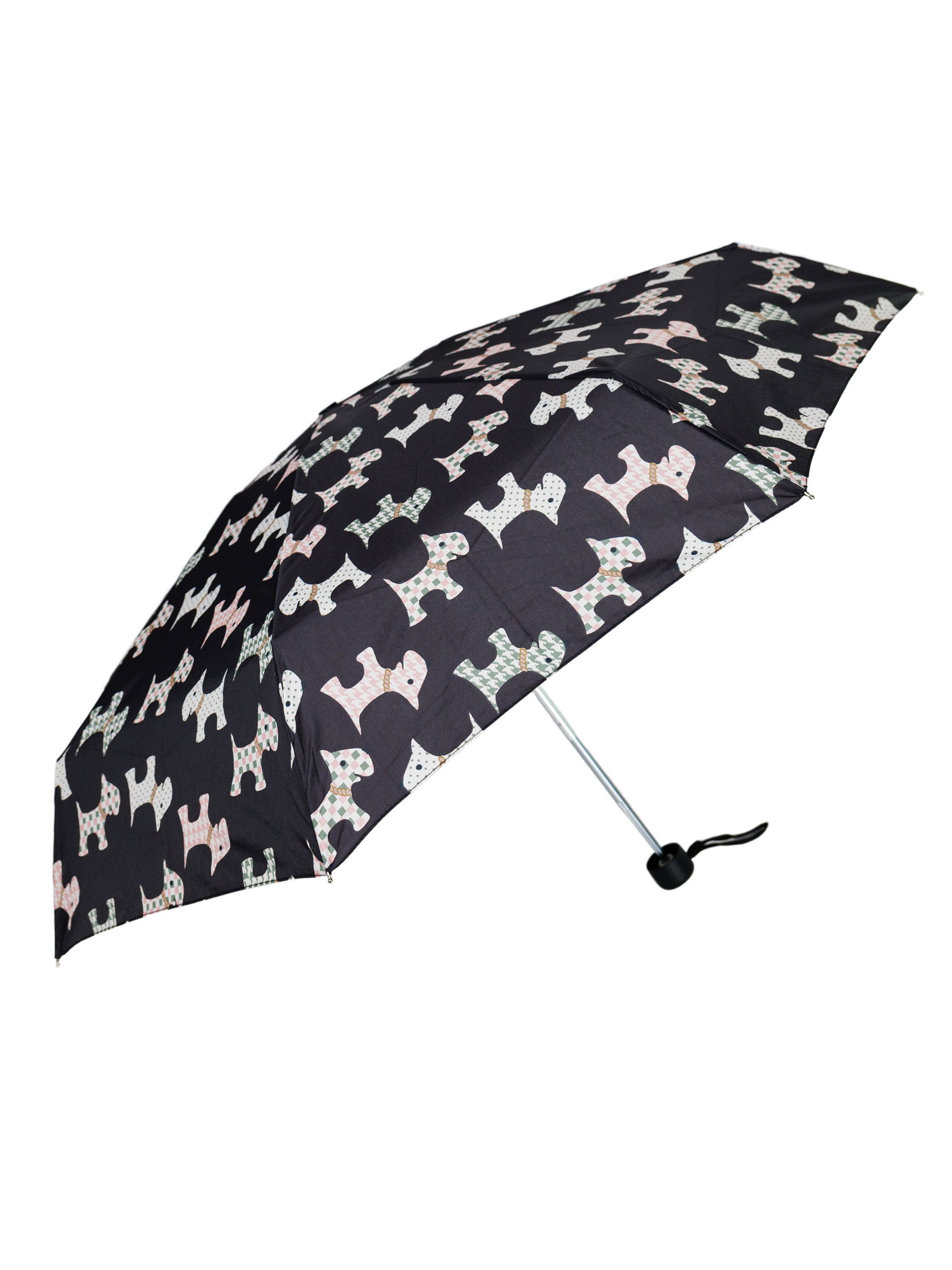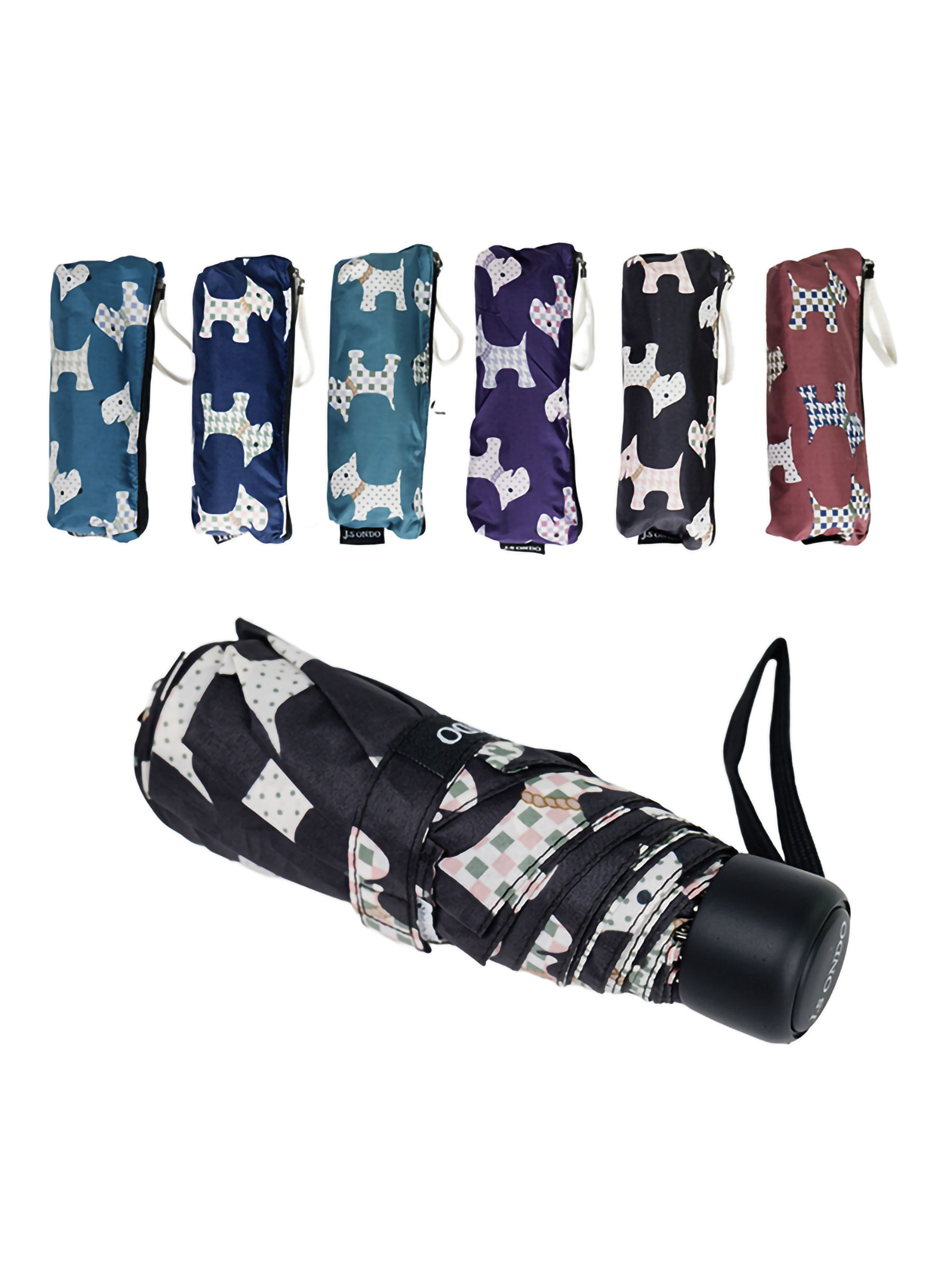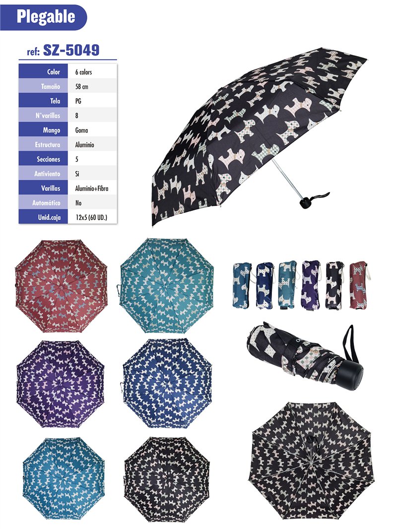 Mini paraguas plegable perritos. Tela PG. Antiviento. No automático. 8 Varillas de aluminio y fibra. Mango de goma. Estructura de aluminio. 5 secciones. Colores surtidos.