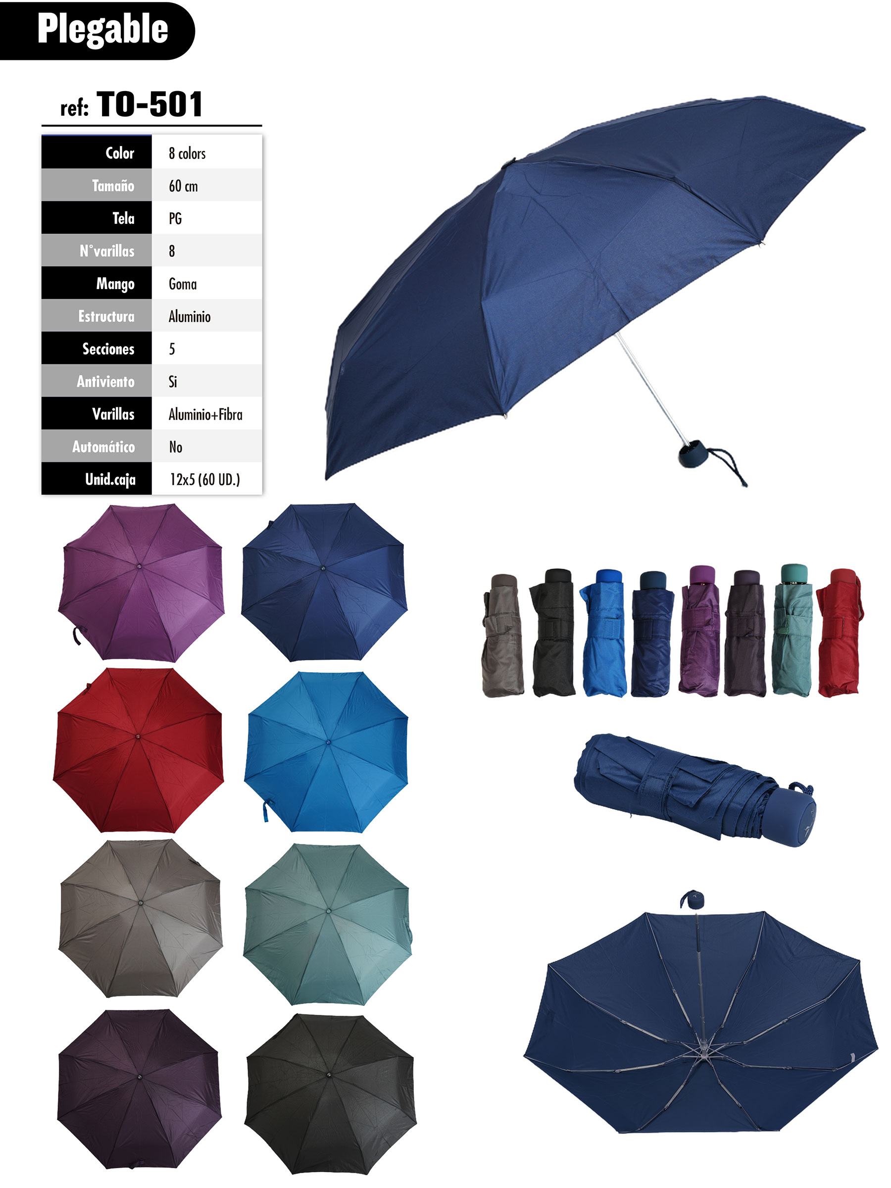Mini paraguas plegable liso. Tela PG. Antiviento. No automático. 8 Varillas de aluminio y fibra. Mango de goma. Estructura de aluminio. 5 secciones. Colores surtidos.