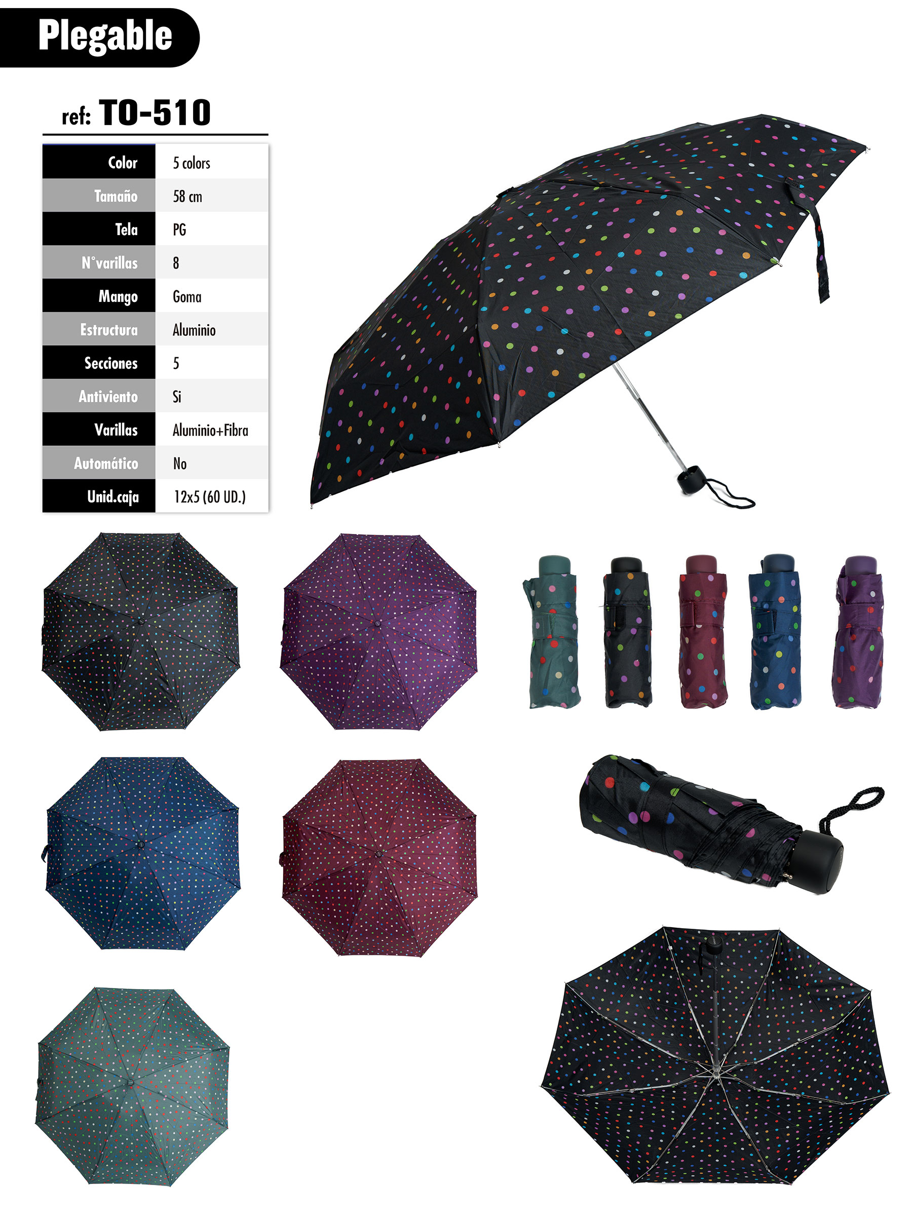 Mini paraguas plegable lunares. Tela PG. Antiviento. No automático. 8 Varillas de aluminio y fibra. Mango de goma. Estructura de aluminio. 5 secciones. Colores surtidos.