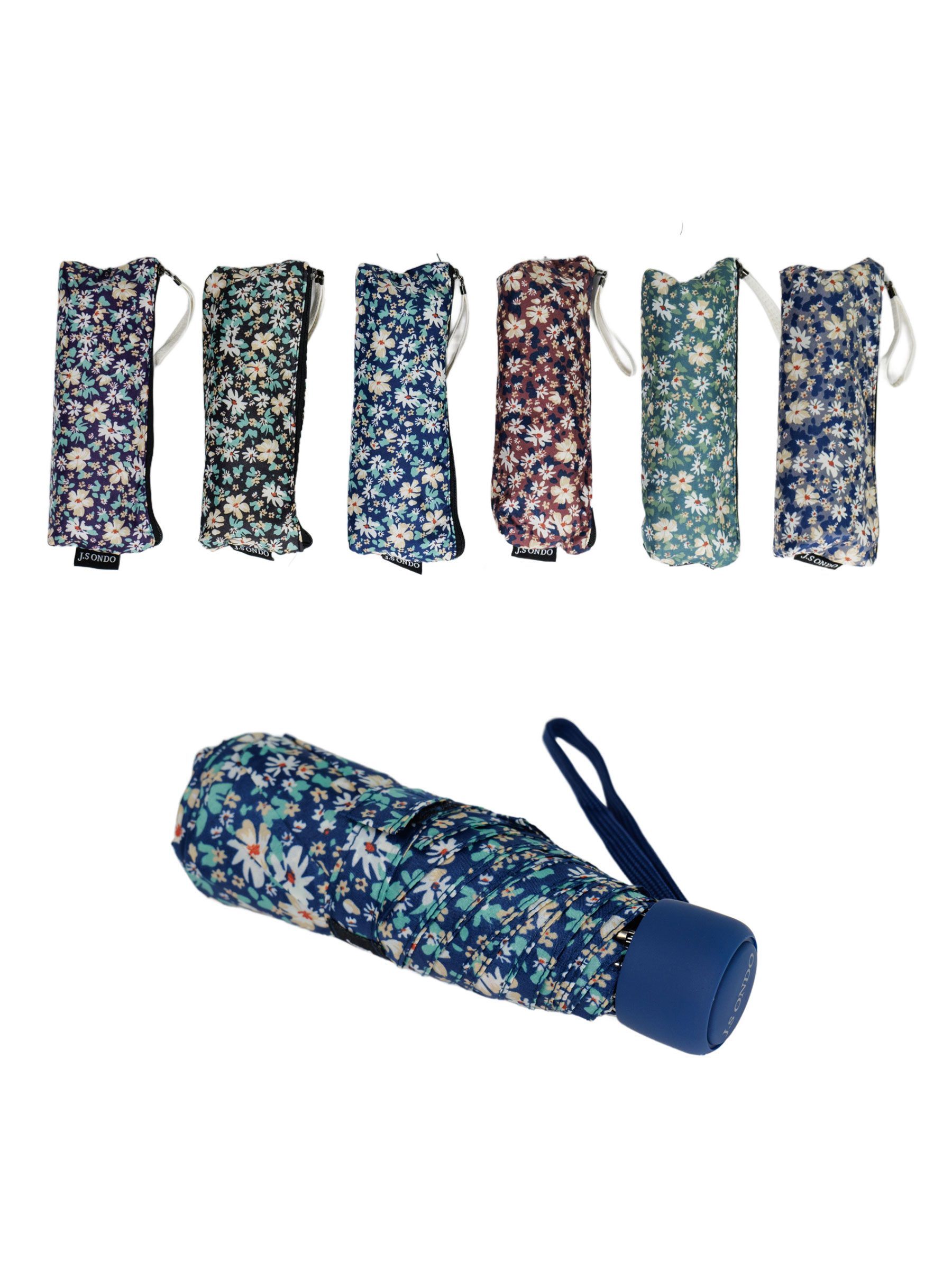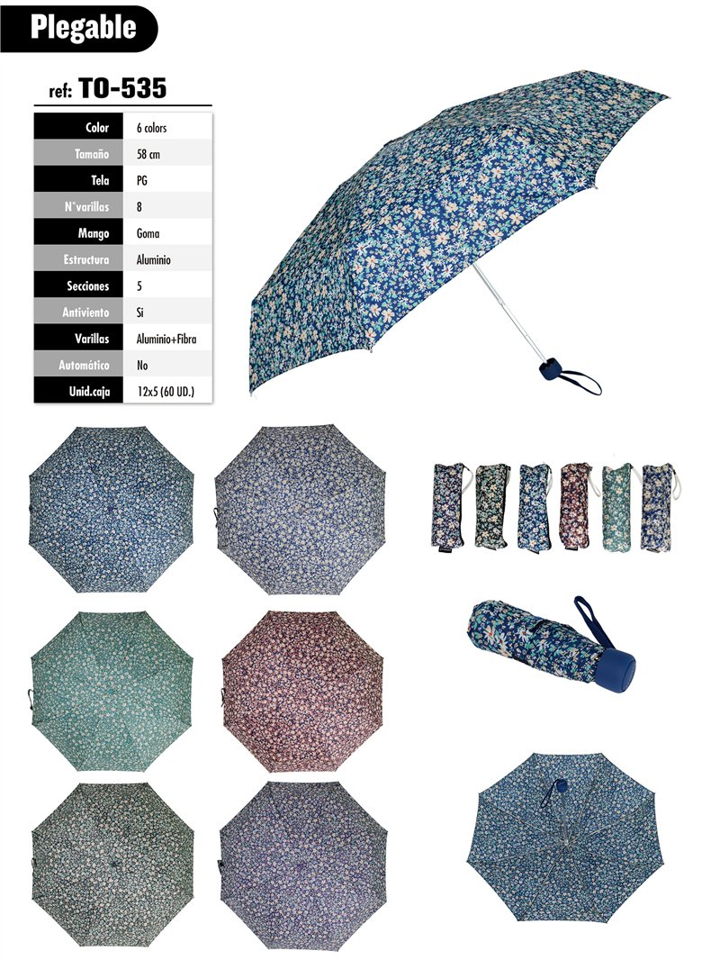 Mini paraguas plegable flores. Tela PG. Antiviento. No automático. 8 Varillas de aluminio y fibra. Mango de goma. Estructura de aluminio. 5 secciones. Colores surtidos.