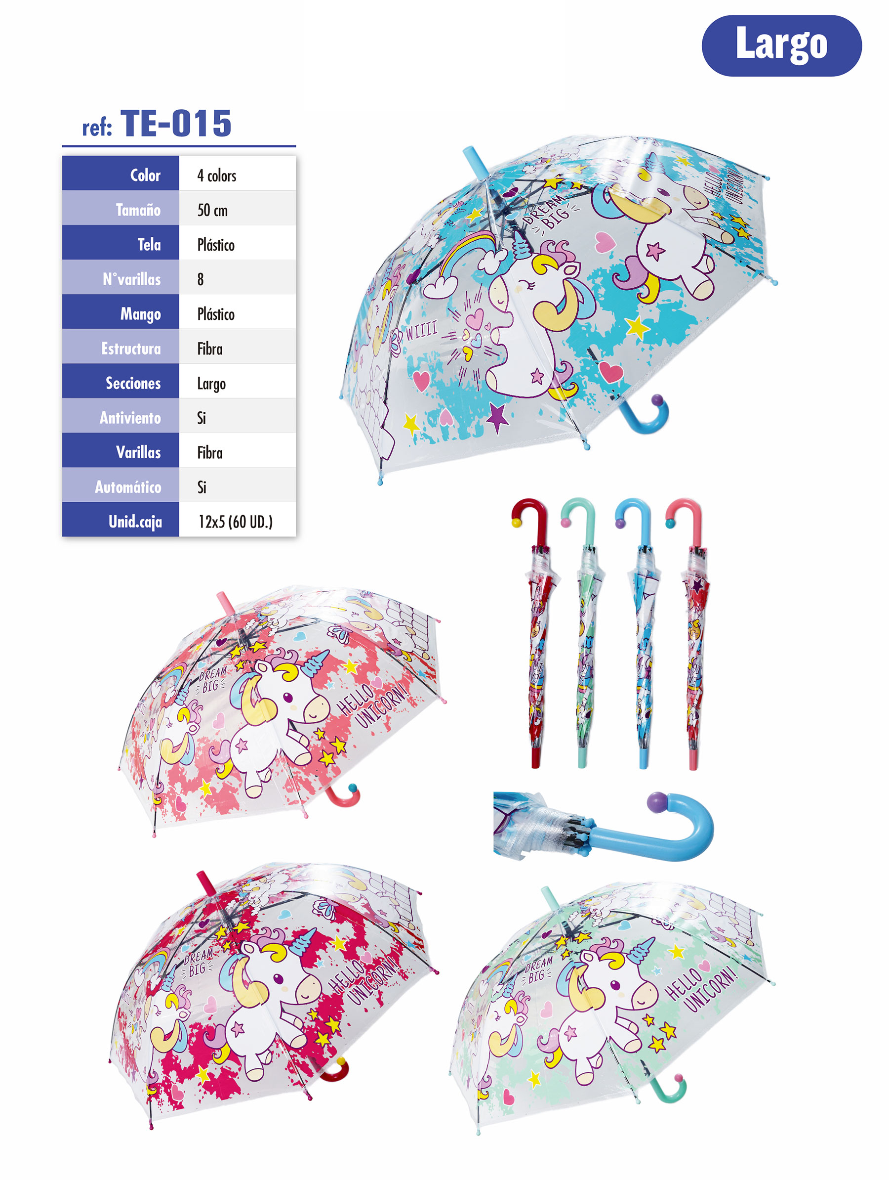 Paraguas largo infantil transparente de 50 cm con estampado de unicornio, 8 varillas de fibra, apertura automática y estructura antiviento. Mango de plástico.