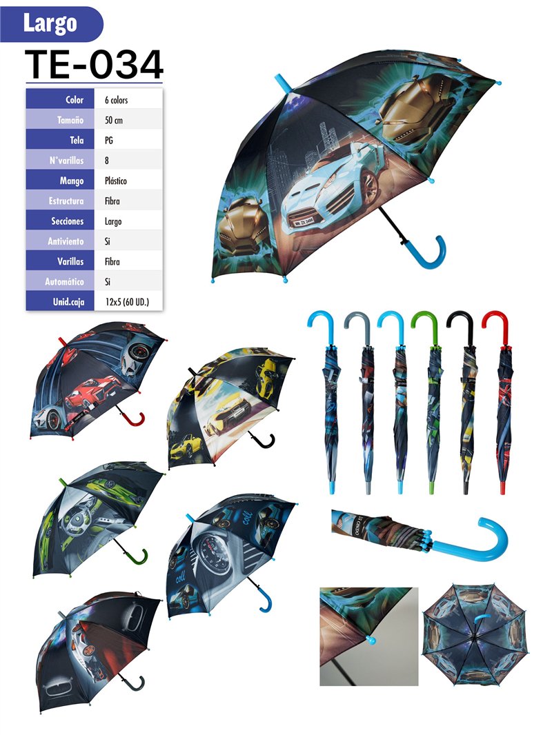 Paraguas largo infantil de 50 cm en tela PG con diseño de coches, 8 varillas de fibra, apertura automática y sistema antiviento. Mango de plástico.