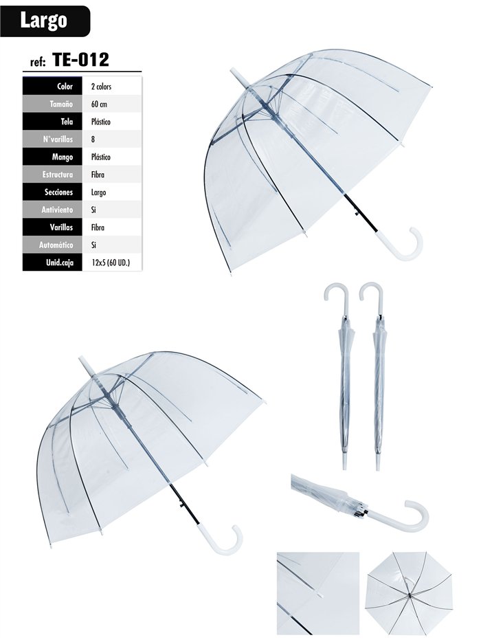 Paraguas largo transparente de 60 cm con 8 varillas de fibra, apertura automática y sistema antiviento. Mango de plástico en gancho.