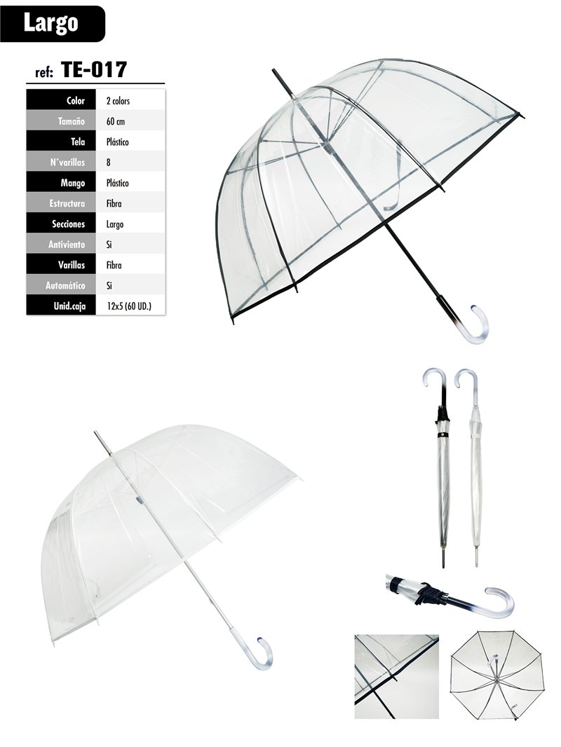 Paraguas largo transparente de 60 cm con 8 varillas de fibra, apertura automática y sistema antiviento. Acabado con vivo de color y mango de plástico en gancho.
