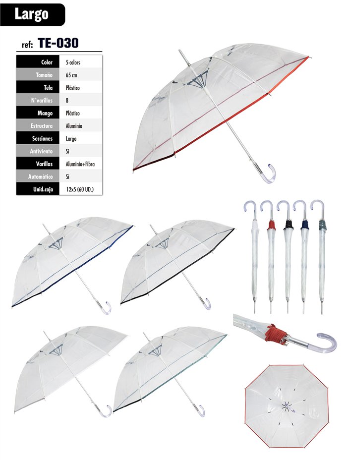 Paraguas largo transparente de 65 cm con ribete de color, estructura de aluminio y varillas de aluminio y fibra, apertura automática y sistema antiviento. Mango de plástico en gancho.