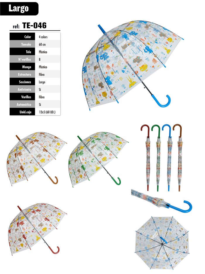 Paraguas largo transparente de 60 cm con estampado de animales, 8 varillas de fibra, apertura automática y sistema antiviento. Mango de plástico en gancho.