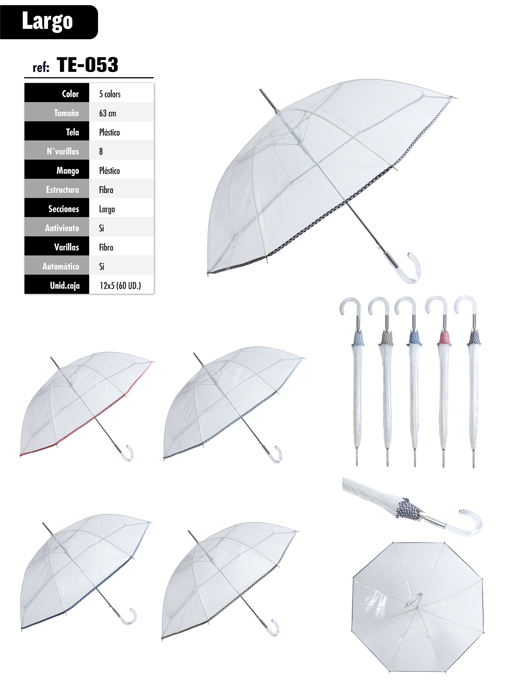Paraguas largo transparente de 63 cm con ribete tipo vichy, 8 varillas de fibra, apertura automática y sistema antiviento. Mango de plástico en gancho.