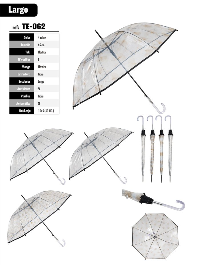 Paraguas largo transparente de 65 cm con estampado de hojas y corazones en dorado, 8 varillas de fibra, apertura automática y sistema antiviento. Mango de plástico en gancho.