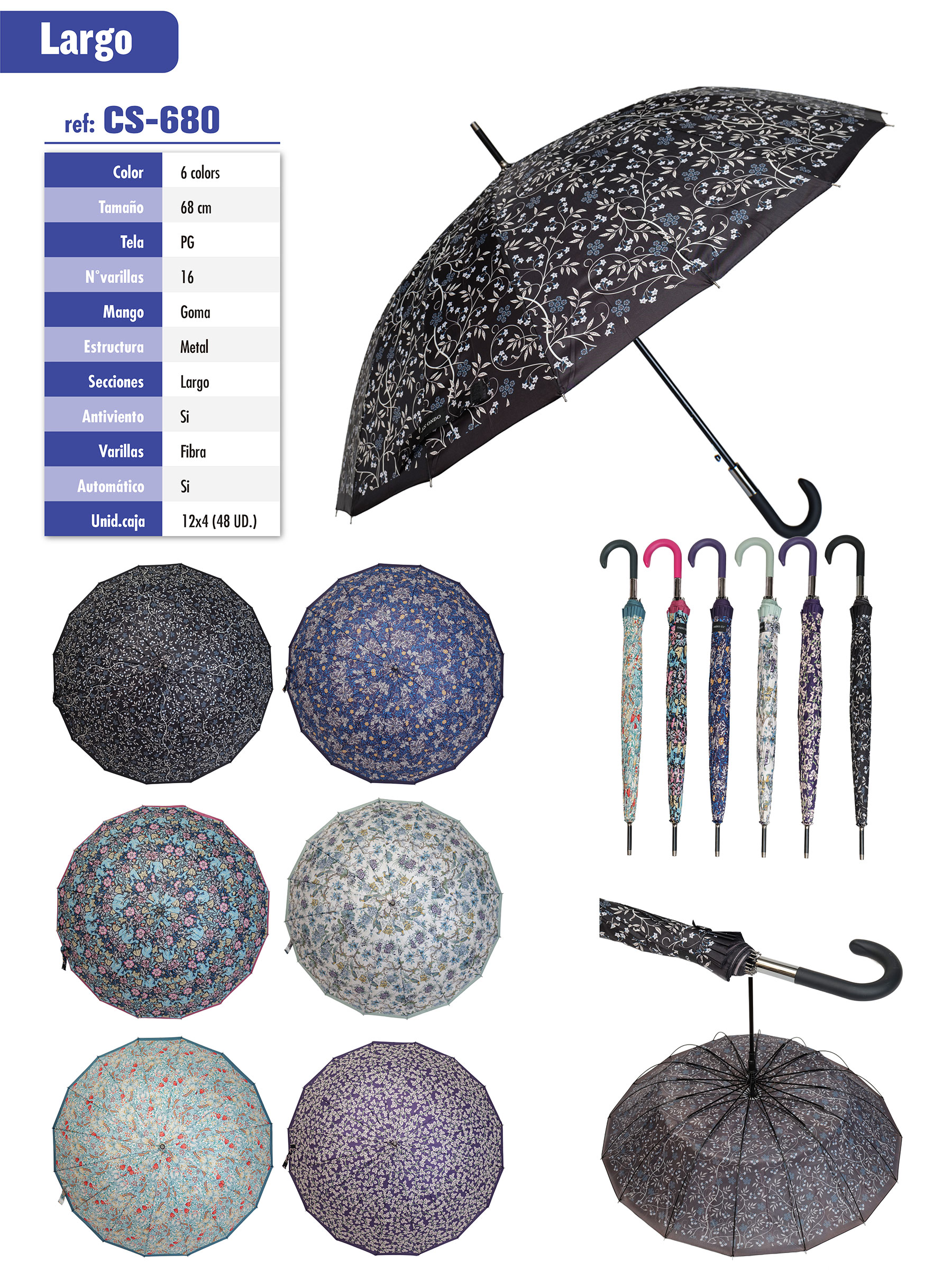 Paraguas largo automático con estampado floral clásico. Cúpula de 68 cm en tejido PG, 16 varillas de fibra y estructura metálica. Resistente al viento y con mango de goma.