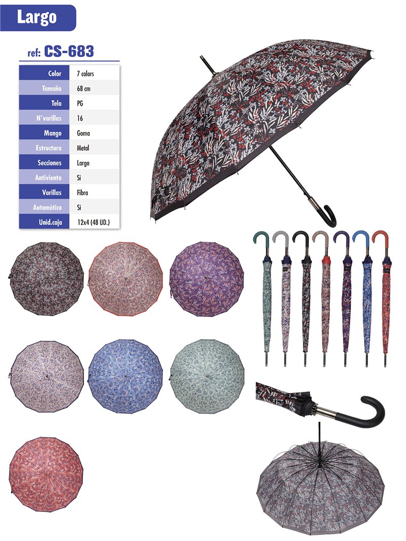 Paraguas largo automático con estampado abstracto. Cúpula de 68 cm en tejido PG, 16 varillas de fibra y estructura metálica. Resistente al viento y con mango de goma.