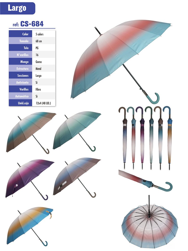 Paraguas largo automático con efecto degradado. Cúpula de 68 cm en tejido PG, 16 varillas de fibra y estructura metálica. Resistente al viento y con mango de goma.