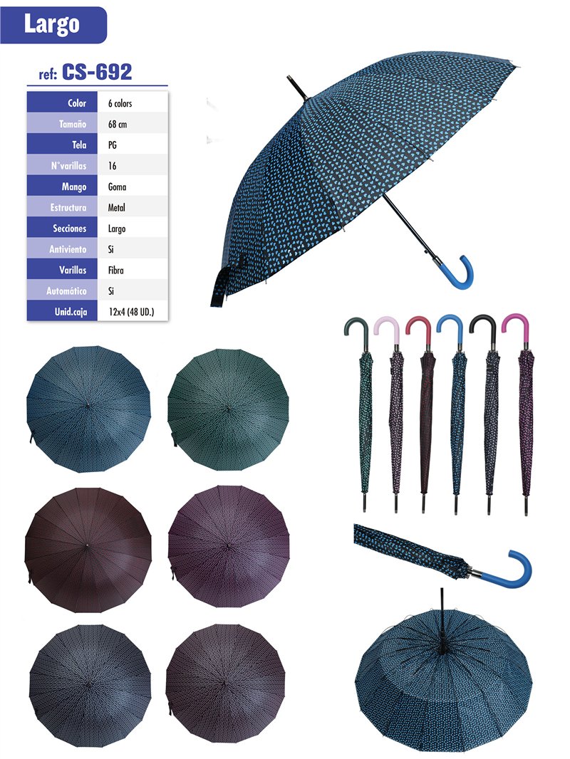 Paraguas largo automático, antiviento. 16 varillas de fibra y estructura metálica. Tejido PG y mango de goma.