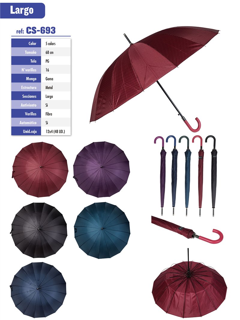 Paraguas largo automático, antiviento. 16 varillas de fibra y estructura metálica. Tejido PG y mango de goma. Microtopos elegantes en tonos lisos.