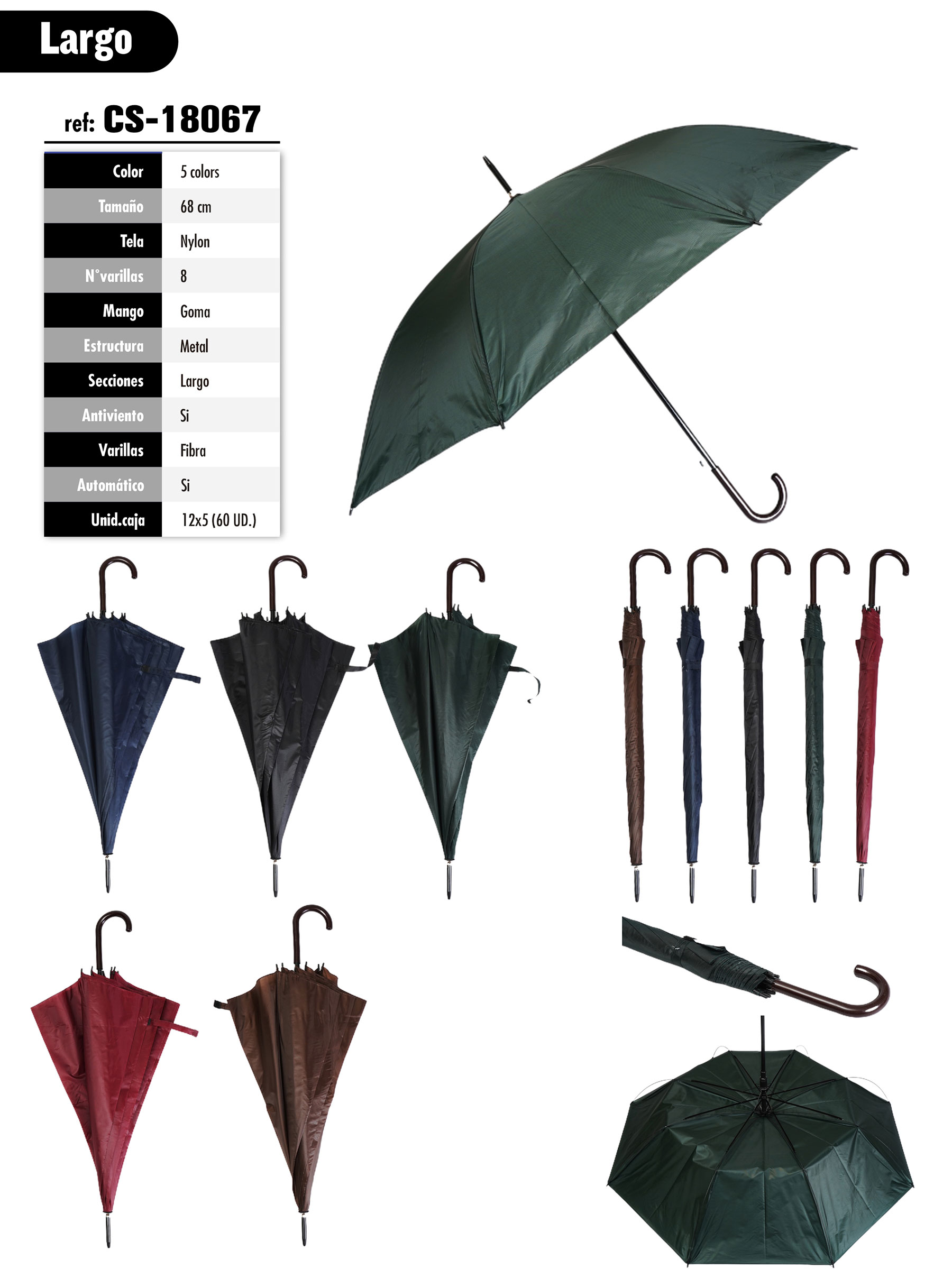 Paraguas largo automático, antiviento. 8 varillas de fibra y estructura metálica. Tejido nylon y mango de goma. Acabado liso en colores básicos.