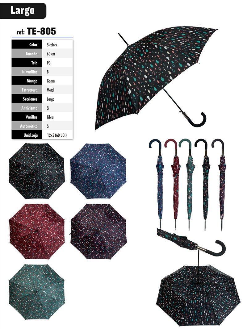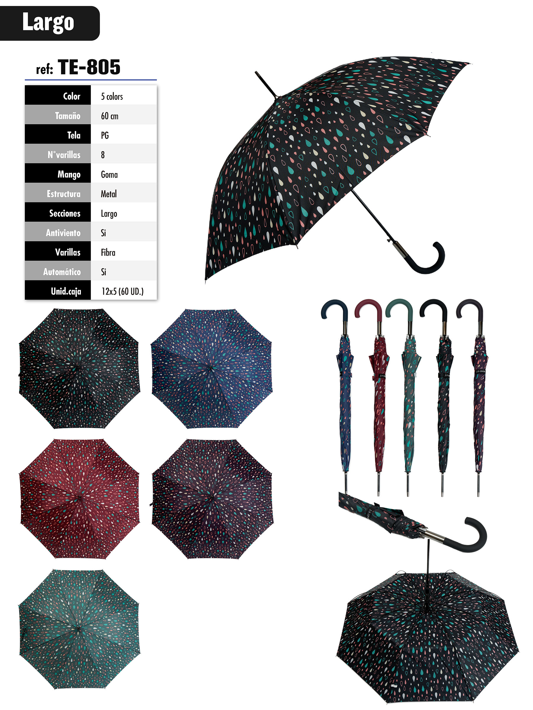 Paraguas largo automático con estampado de gotas. Varillas de fibra y estructura metálica antiviento, mango de goma y tela PG.