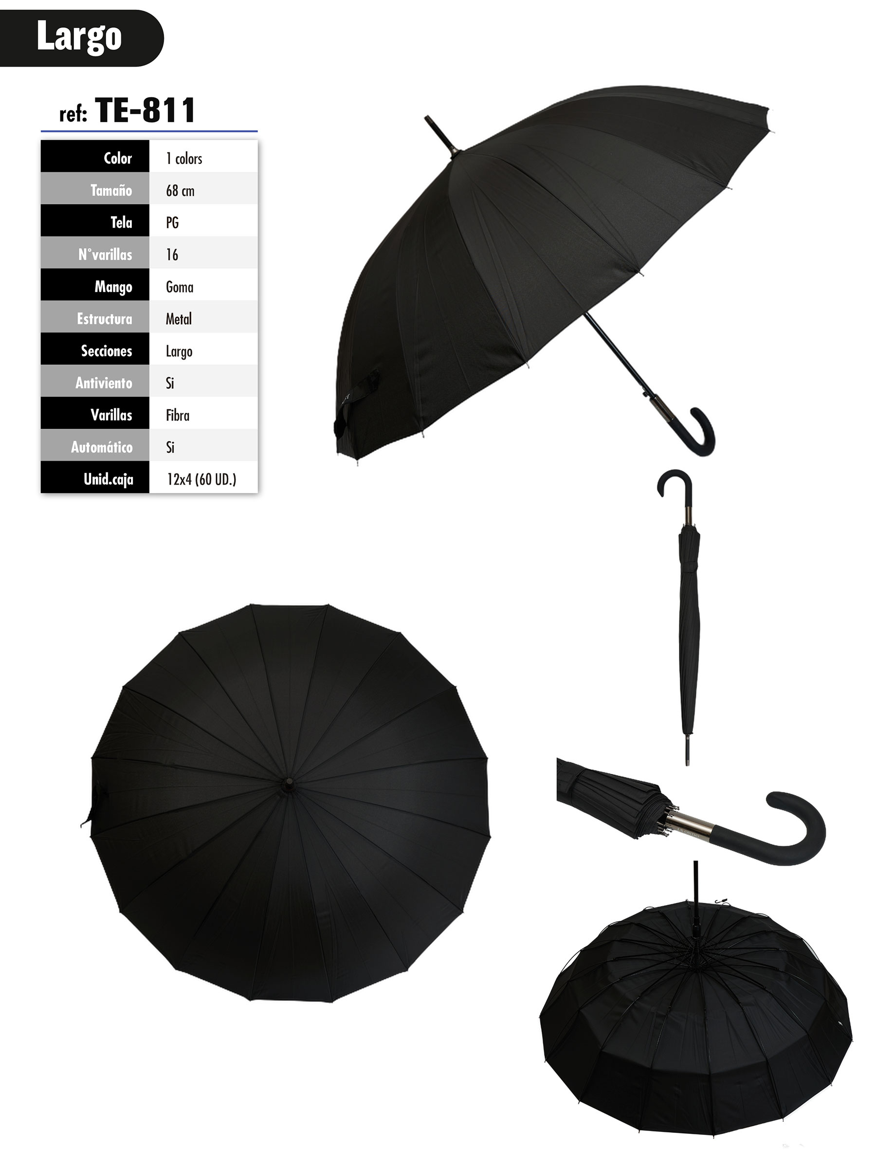 Paraguas largo automático con 16 varillas para mayor estabilidad. Varillas de fibra y estructura metálica antiviento, mango de goma y tela PG.