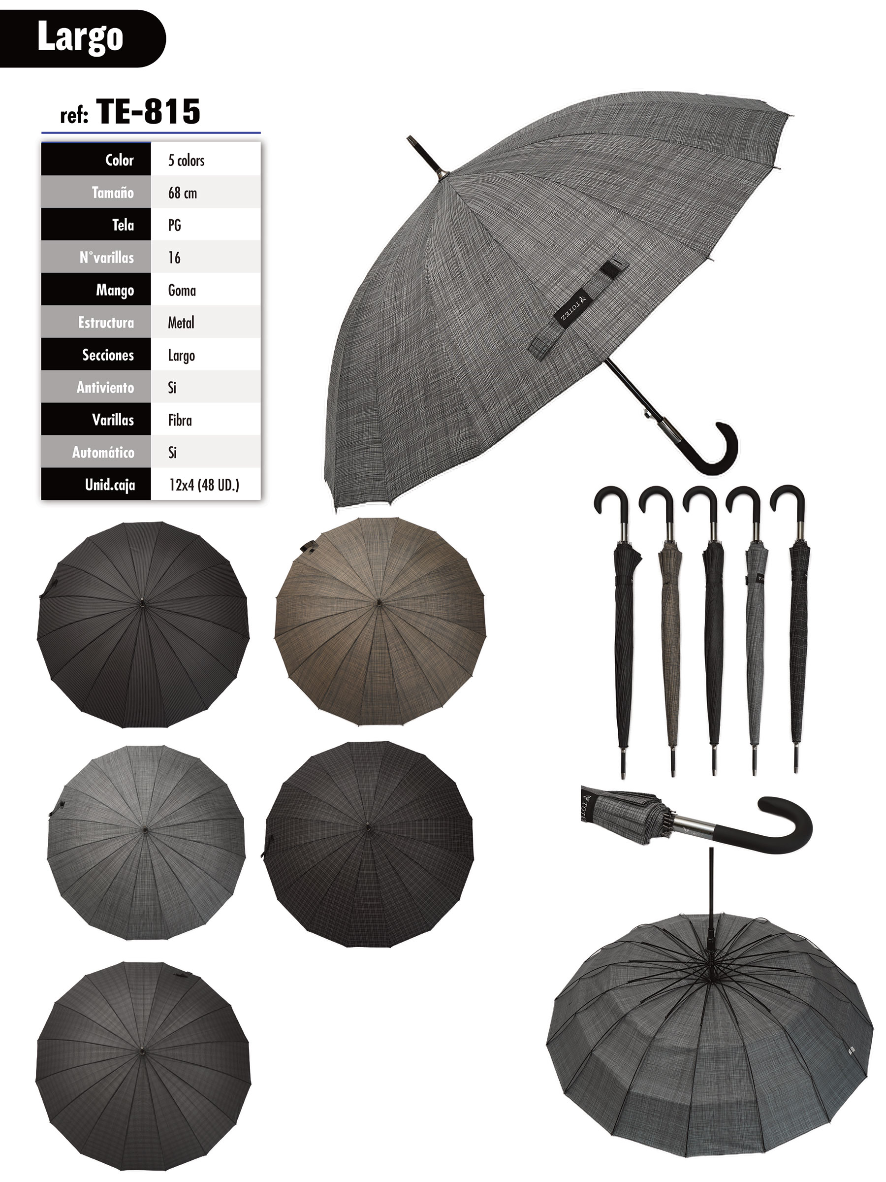 Paraguas largo automático de 16 varillas con tejido efecto jaspeado. Varillas de fibra y estructura metálica antiviento, mango de goma y tela PG.