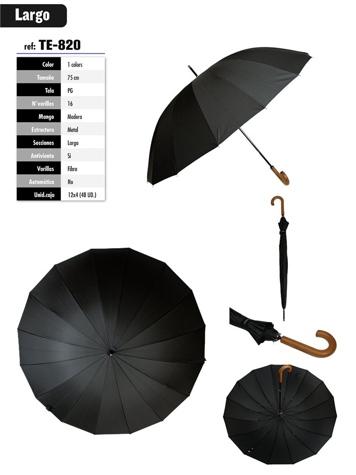 Paraguas largo de apertura manual con 16 varillas. Mango de madera, estructura metálica antiviento y tela PG.
