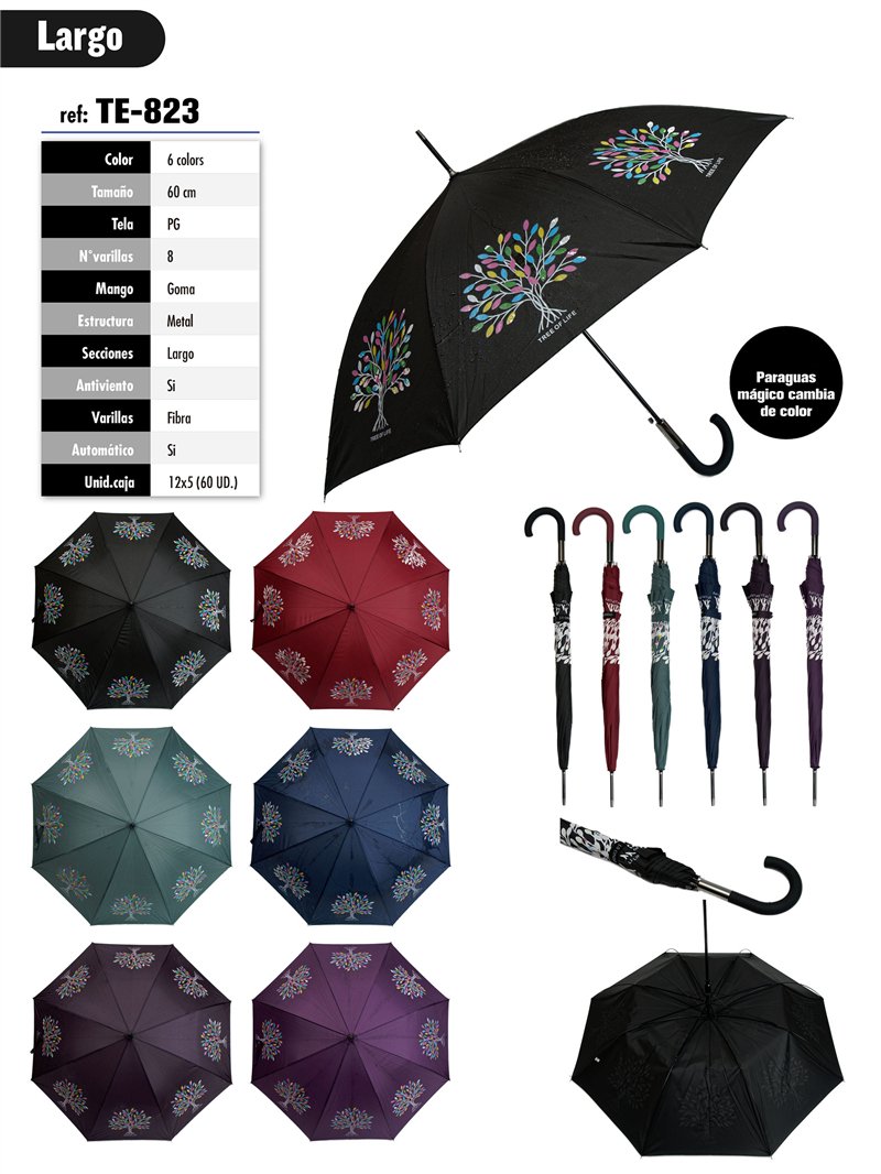 Paraguas largo automático con dibujo de árbol y efecto que cambia de color con la lluvia. Varillas de fibra y estructura metálica antiviento, mango de goma y tela PG.