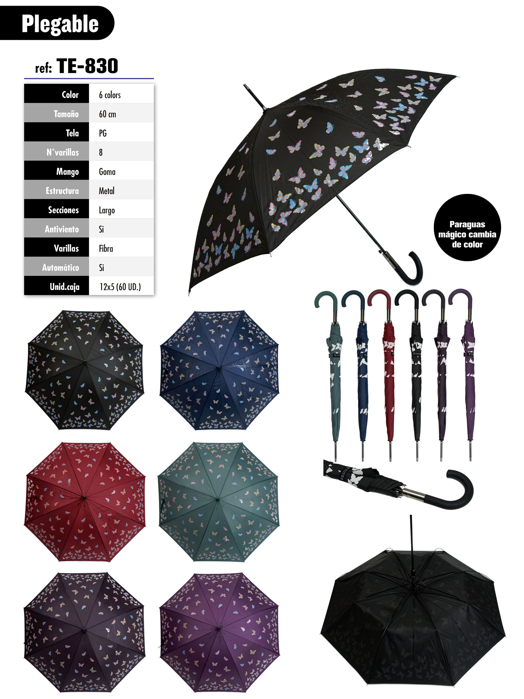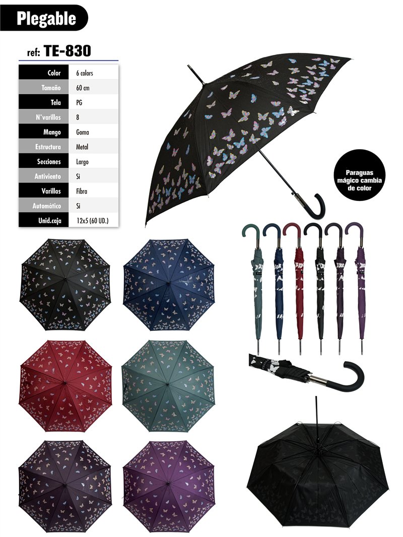 Paraguas largo automático con mariposas que se colorean al contacto con el agua. Varillas de fibra y estructura metálica antiviento, mango de goma y tela PG.