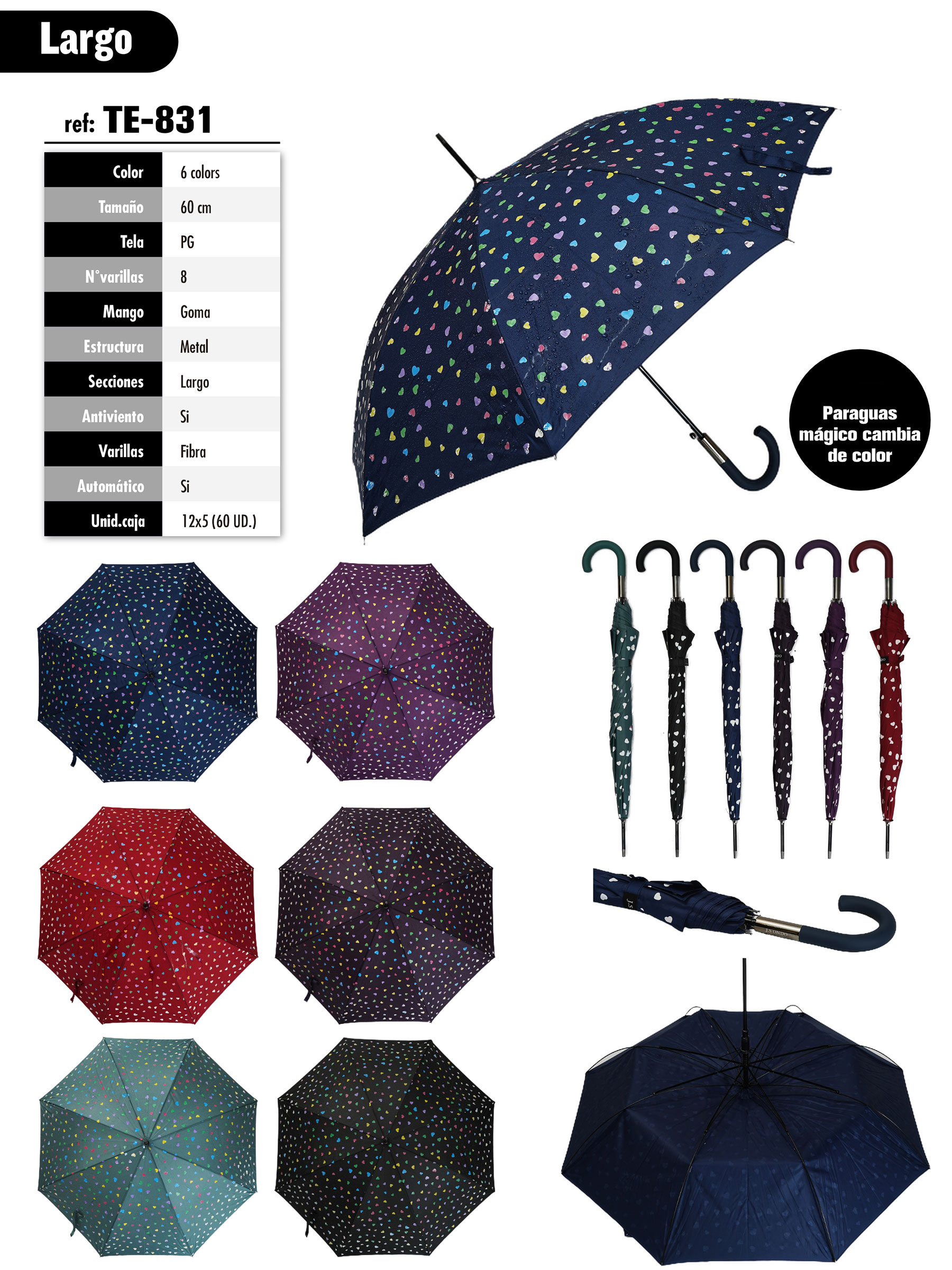 Paraguas largo automático con estampado de corazones que se colorean con la lluvia. Varillas de fibra y estructura metálica antiviento, mango de goma y tela PG.