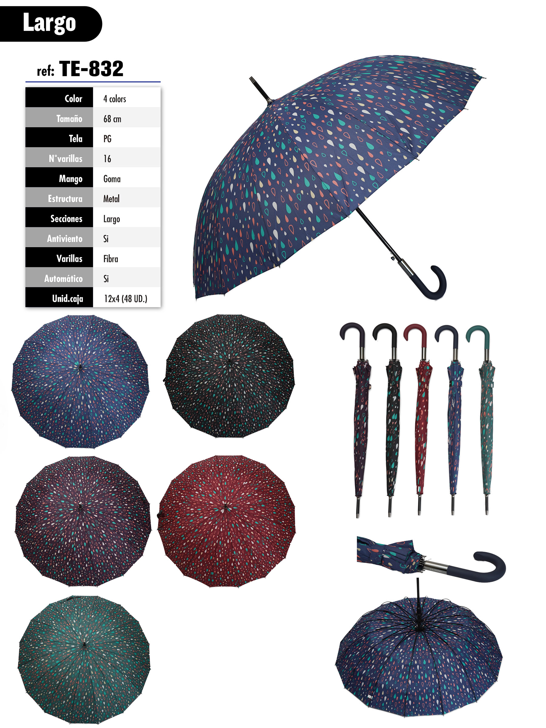 Paraguas largo automático con diseño de gotas. Varillas de fibra y estructura metálica antiviento, mango de goma y tela PG.