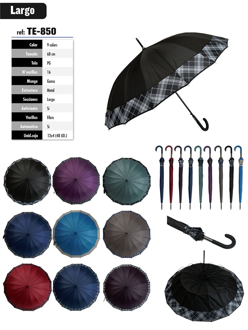 Paraguas largo automático de color liso con ribete de cuadros y 16 varillas. Varillas de fibra y estructura metálica antiviento, mango de goma y tela PG.