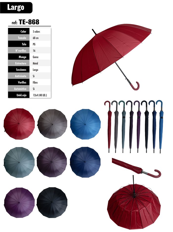 Paraguas largo automático liso con 16 varillas de fibra. Mango de goma, estructura metálica y sistema antiviento.