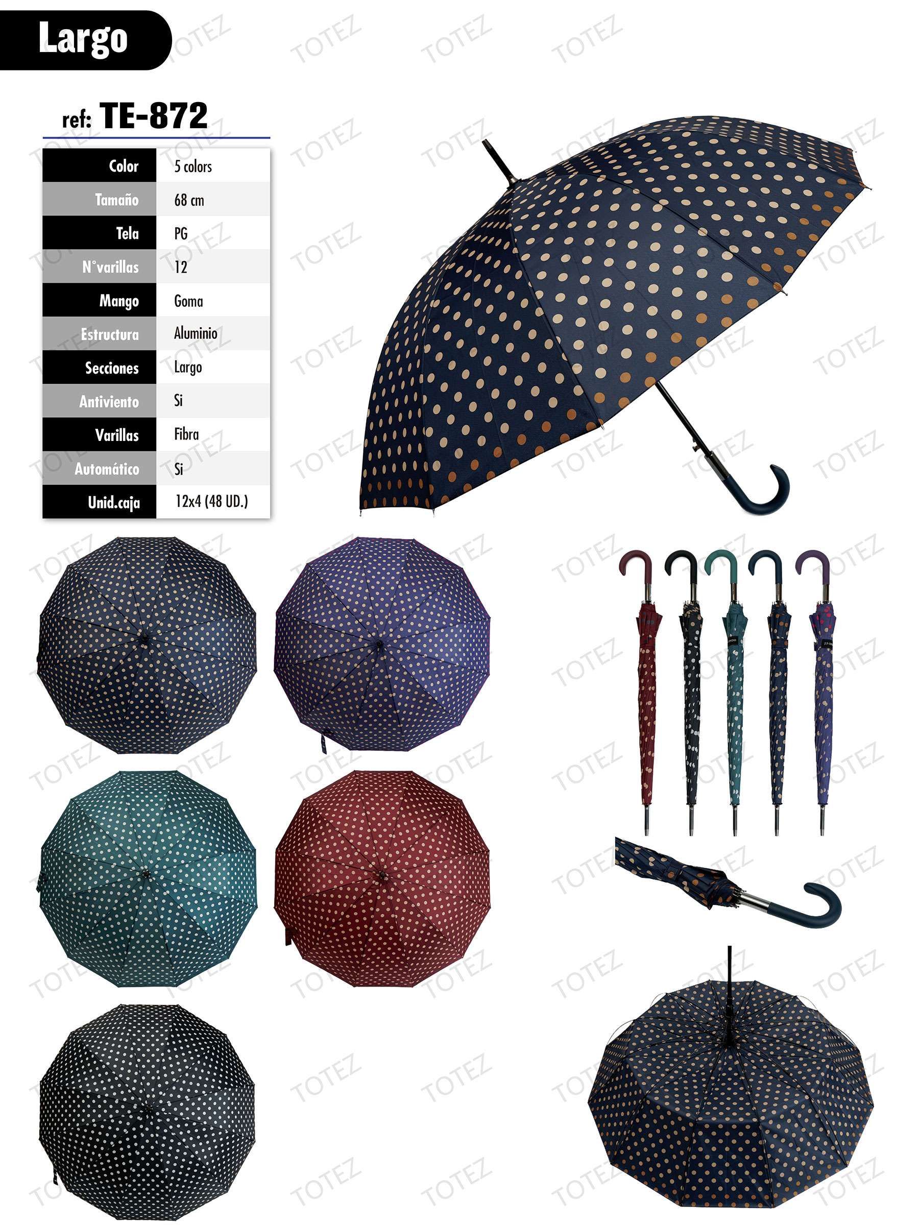 Paraguas largo automático de lunares con 12 varillas de fibra y estructura de aluminio. Mango de goma y sistema antiviento.