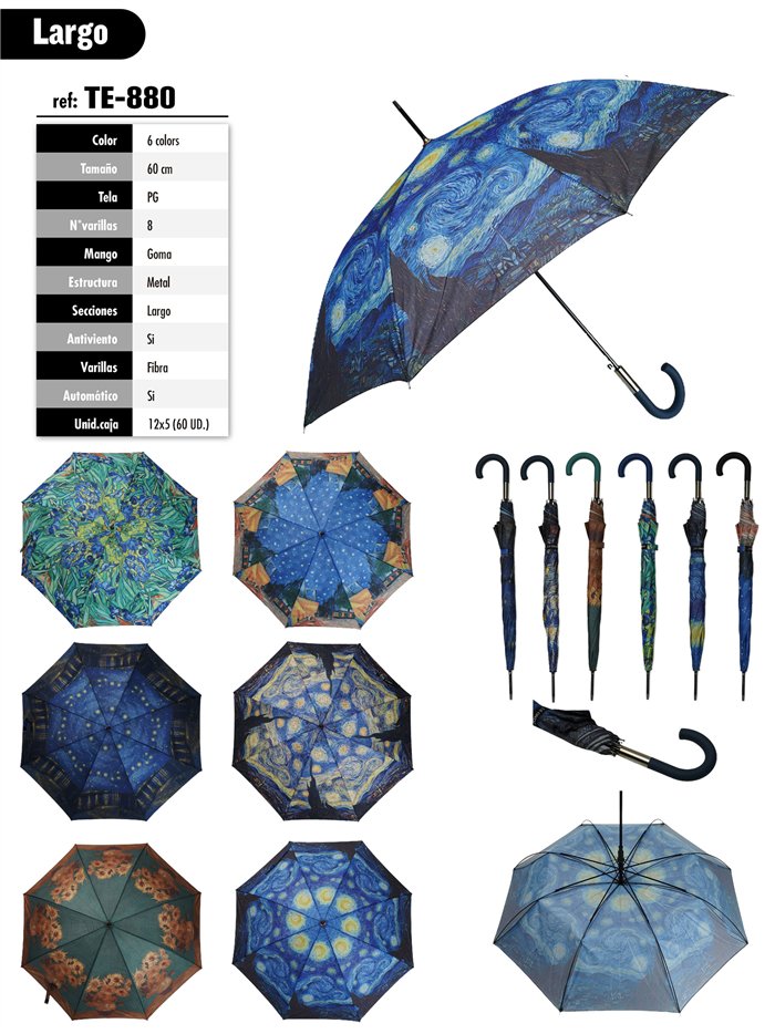 Paraguas largo automático con 8 varillas de fibra y estructura metálica. Tejido PG con estampados artísticos, mango de goma y sistema antiviento.