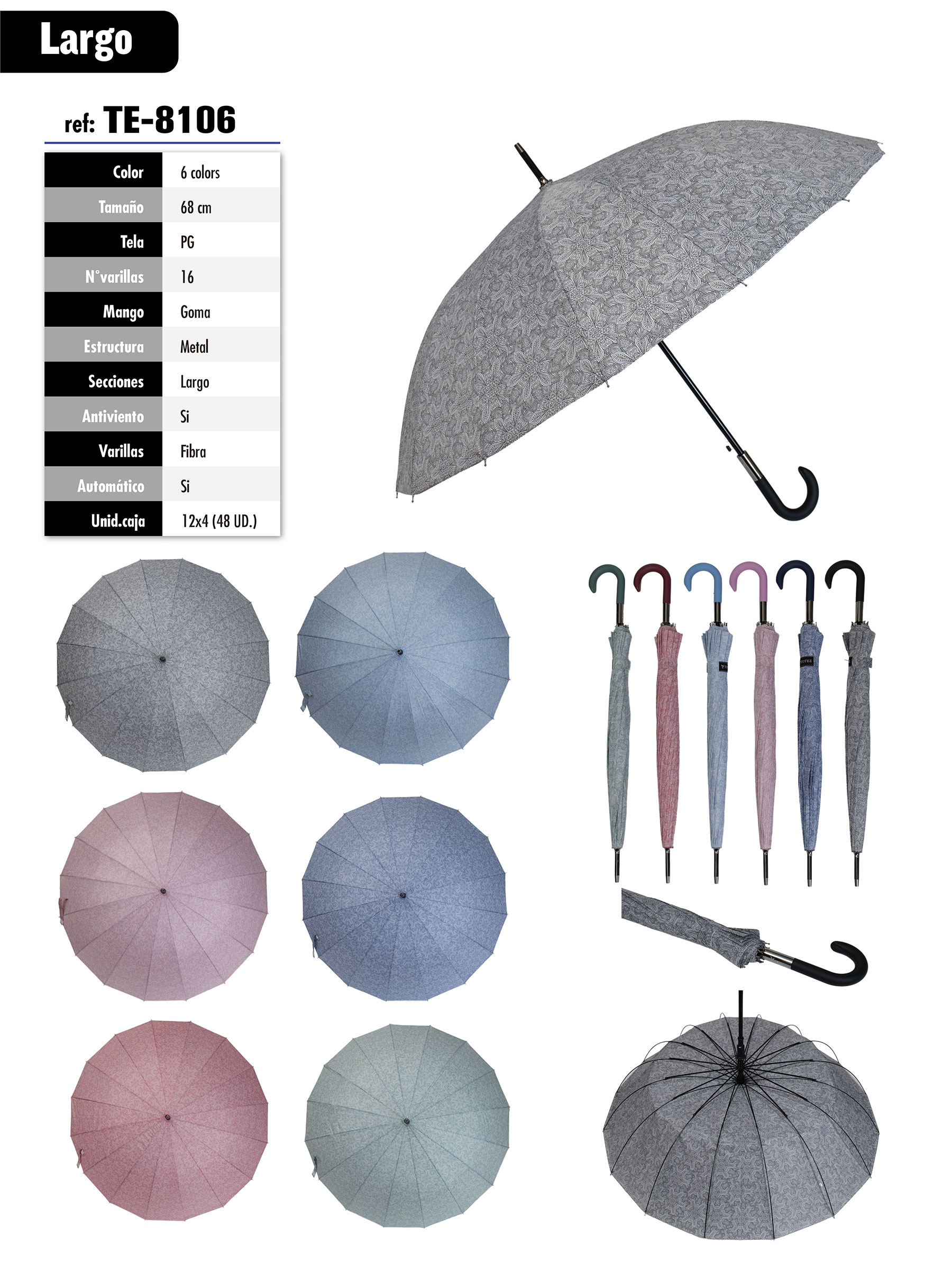 Paraguas largo automático con 16 varillas de fibra y estructura metálica. Tejido PG. Sistema antiviento y mango de goma.