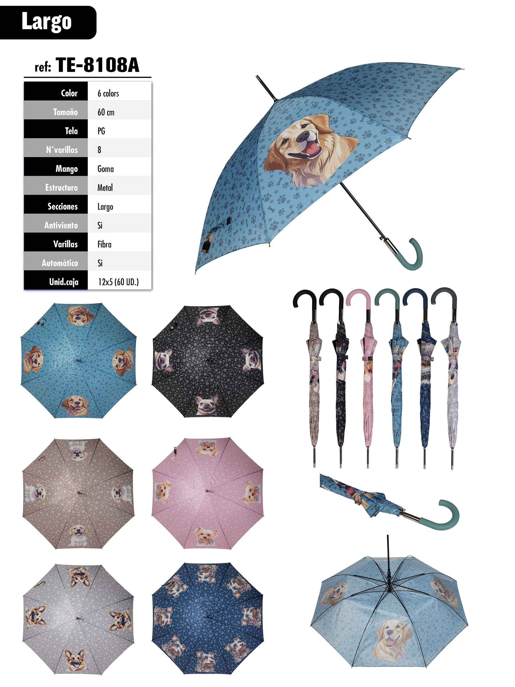 Paraguas largo automático con 8 varillas de fibra y estructura metálica. Tejido PG con retratos de perros. Sistema antiviento y mango de goma.