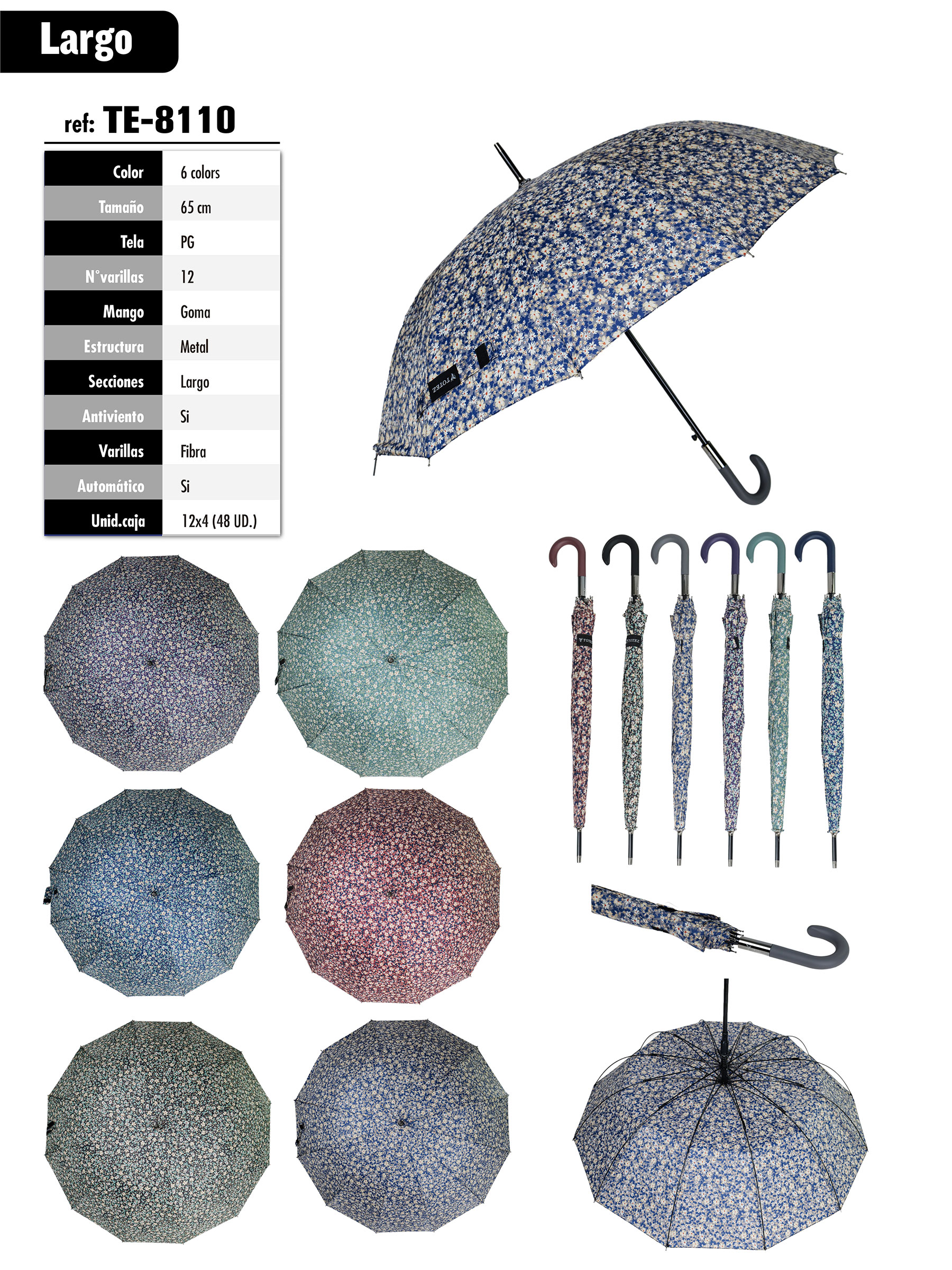 Paraguas largo automático con 12 varillas de fibra y estructura metálica. Tejido PG con flores menudas estilo liberty. Sistema antiviento y mango de goma.