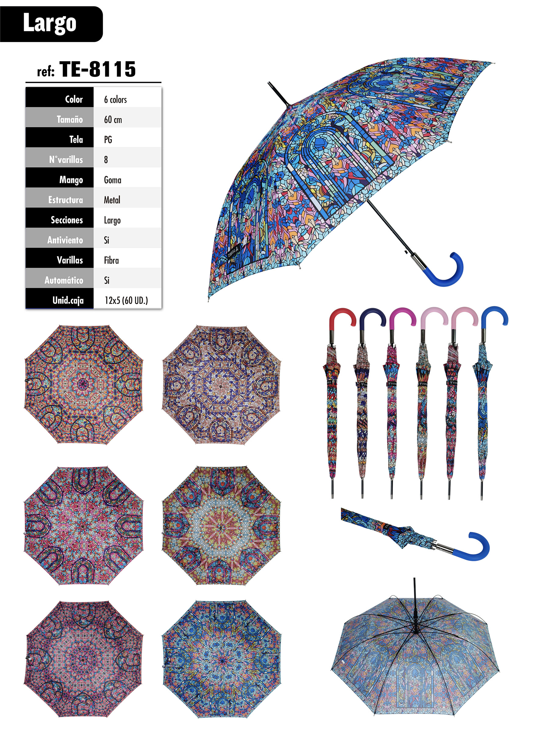Paraguas largo automático con 8 varillas de fibra y estructura metálica. Tejido PG con diseño de mosaico tipo vidriera. Sistema antiviento y mango de goma.