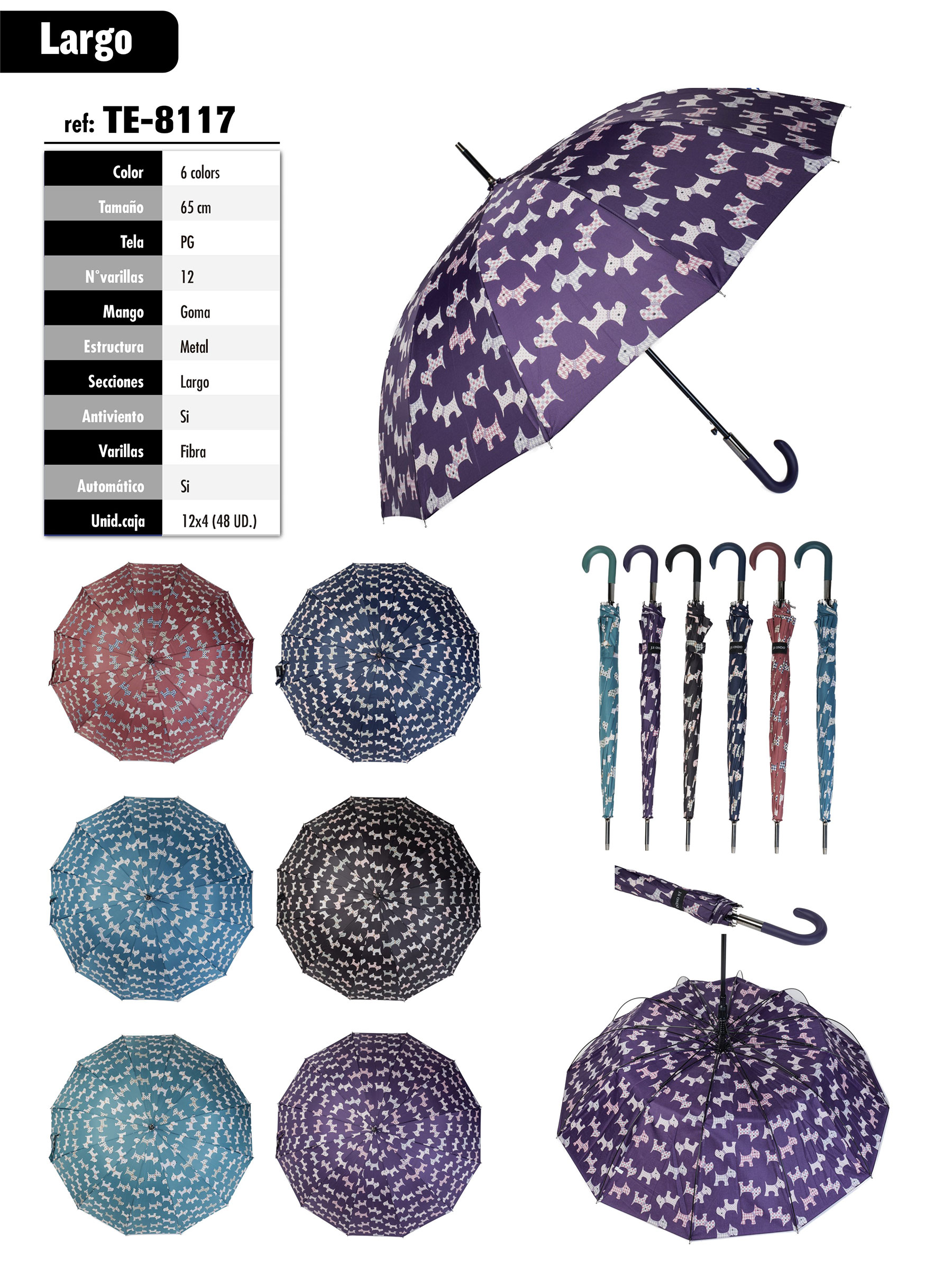 Paraguas largo automático con 12 varillas de fibra y estructura metálica. Tejido PG con estampado de perros en contraste. Sistema antiviento y mango de goma.