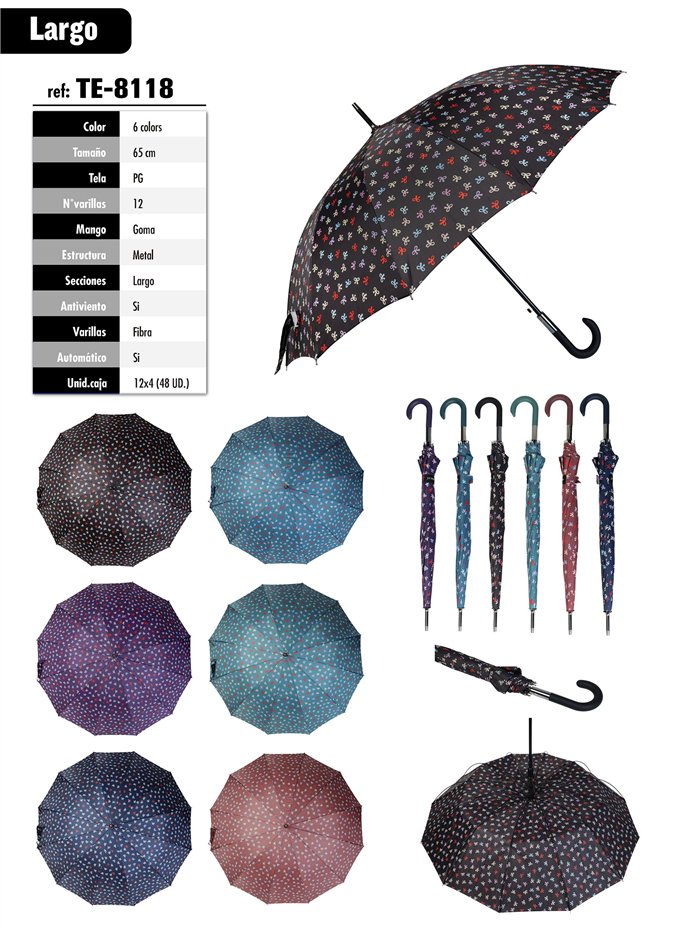 Paraguas largo automático con 12 varillas de fibra y estructura metálica. Tejido PG. Sistema antiviento y mango de goma.