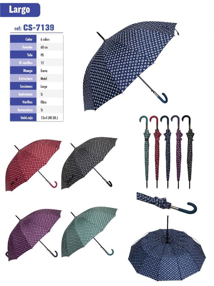 Paraguas largo automático con 12 varillas de fibra y estructura metálica. Tejido PG con patrón de micro círculos. Sistema antiviento y mango de goma.