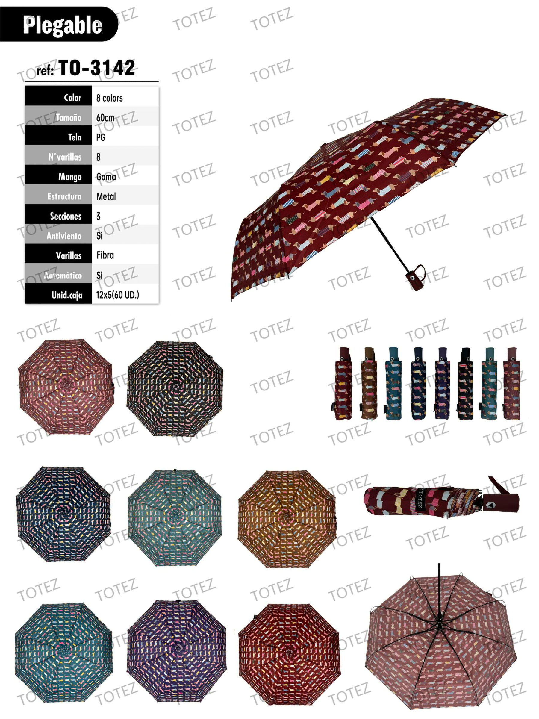 Paraguas plegable automático de 3 secciones con 8 varillas de fibra y estructura metálica. Tejido PG con estampado de perros salchicha. Antiviento y funda a juego.
