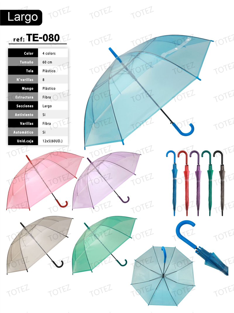 Paraguas largo automático transparente en tonos de color. Estructura de fibra con sistema antiviento. Mango de gancho de plástico.