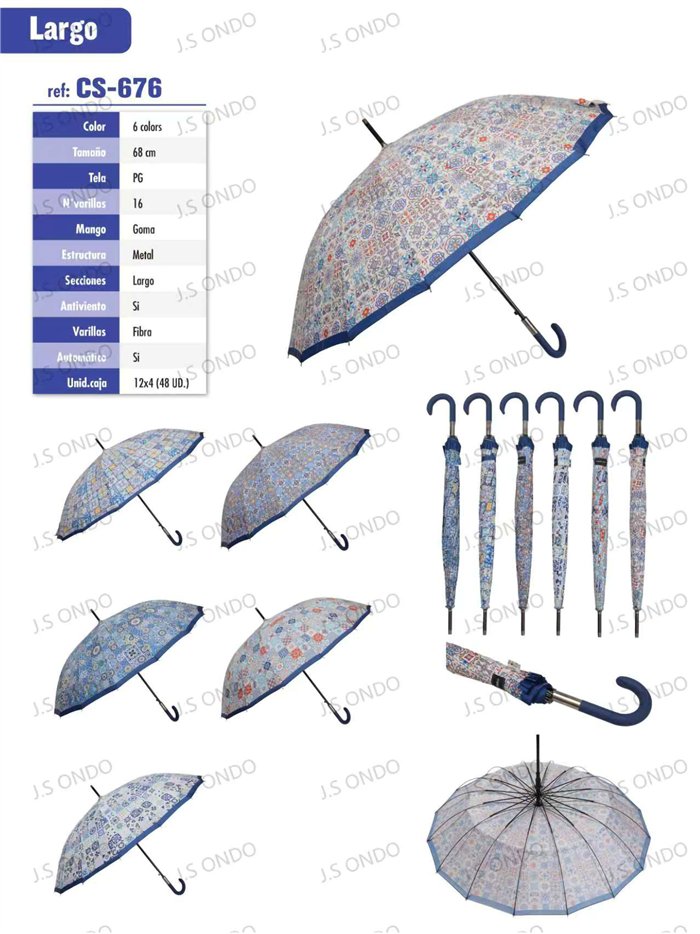 Paraguas largo automático con estampado de azulejos. Sistema antiviento. 16 varillas de fibra y estructura metálica. Mango de goma.