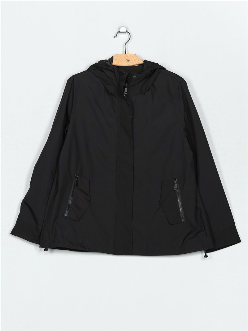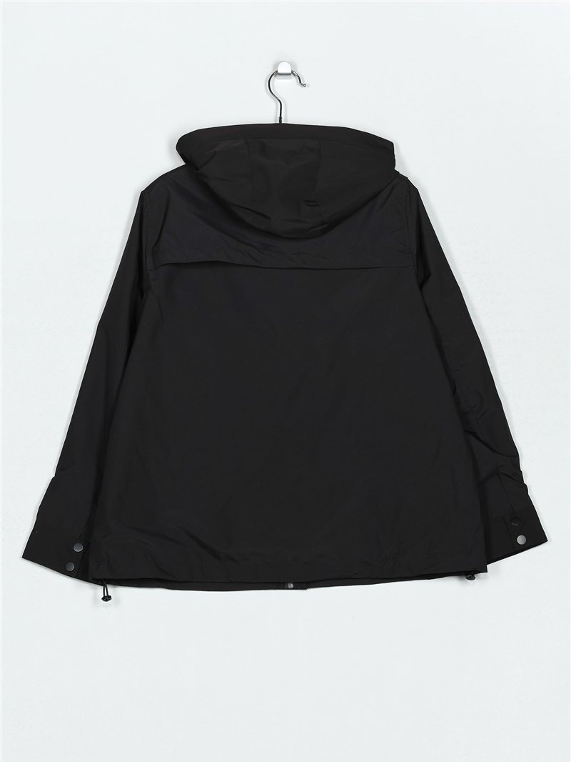 Parka con capucha. Bajo ajustable con cordón elástico. Bolsillos laterales. Cuello subido. Manga larga. Cierre con cremallera central y botones de presión.