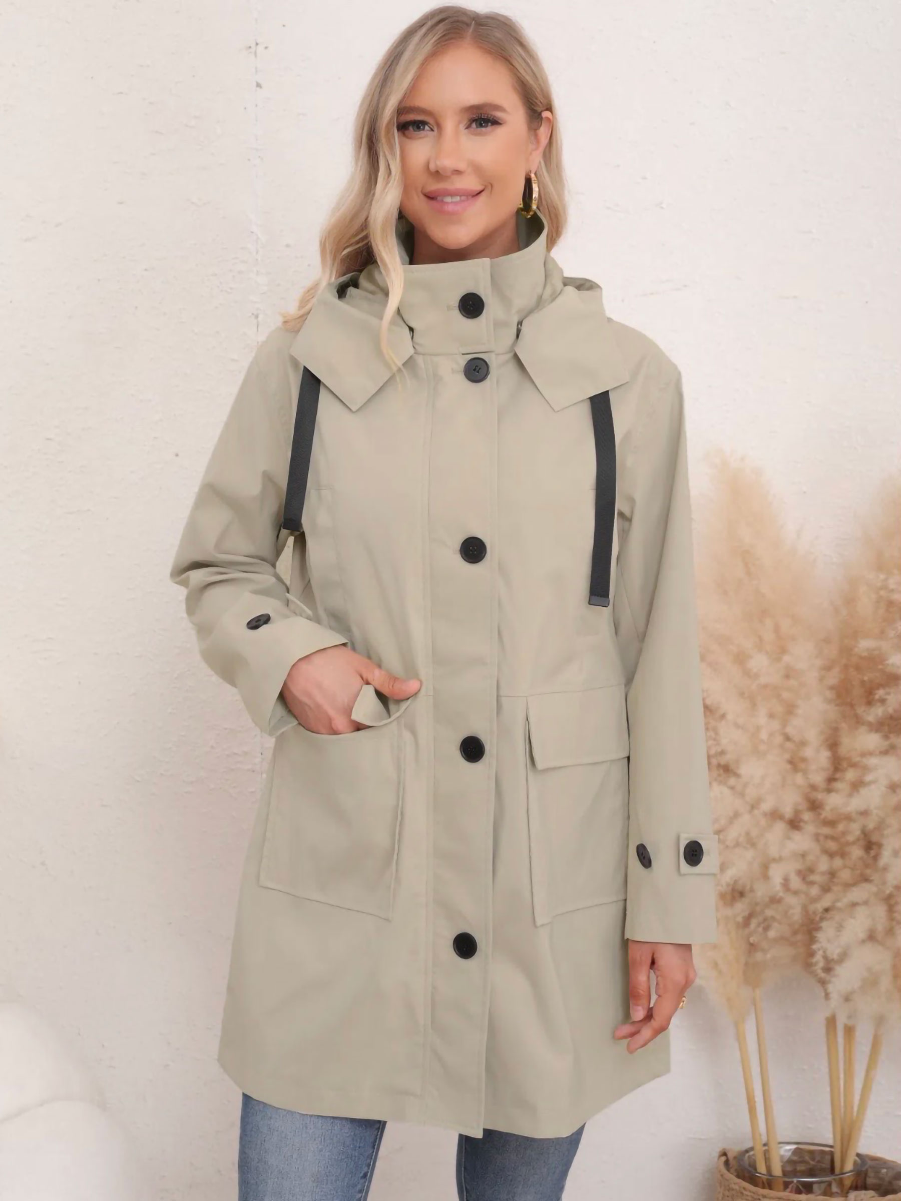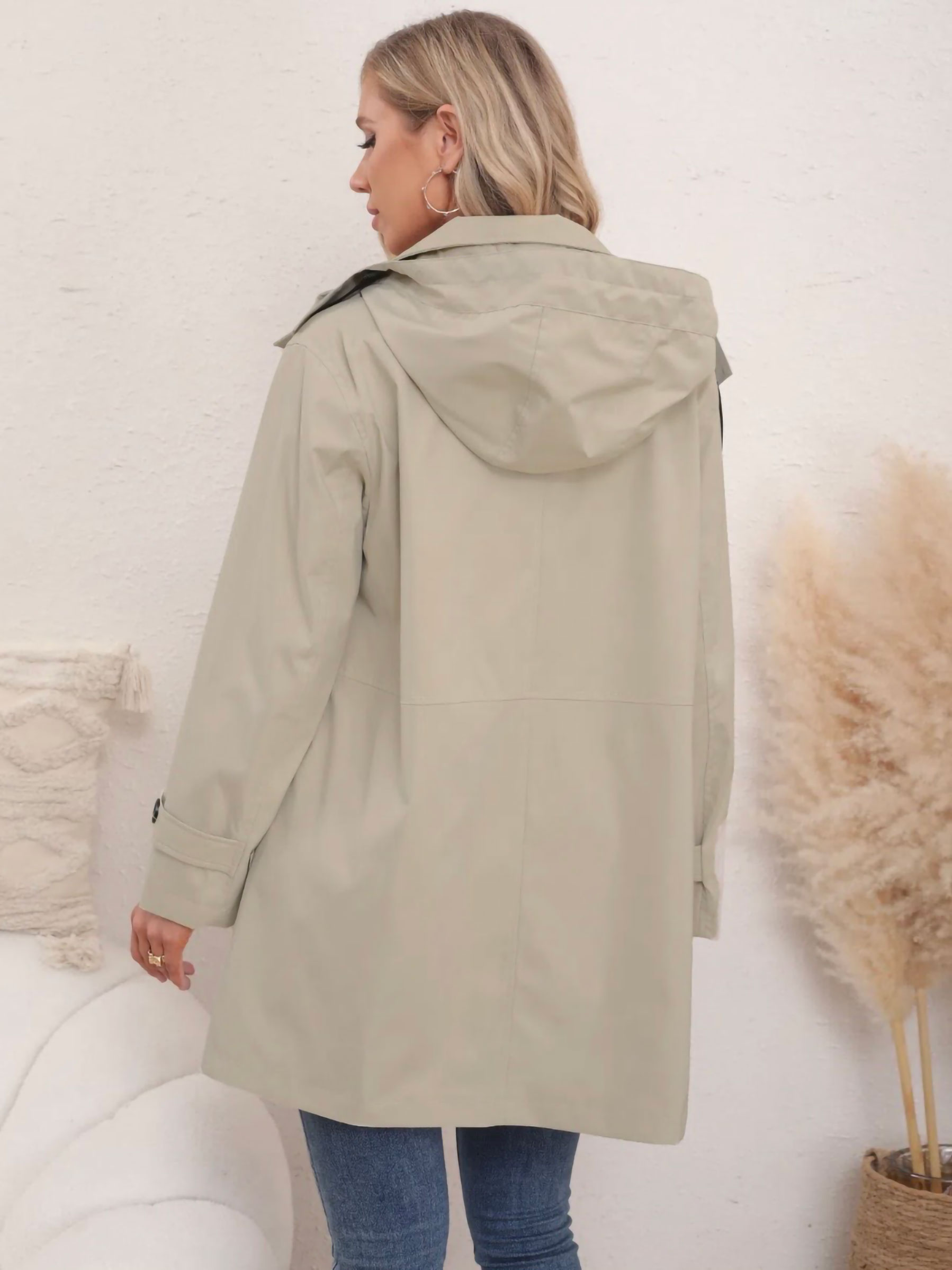 Parka amplia con capucha. Bolsillos frontal con solapa. Cierre con cremallera central y botones. Manga larga.
