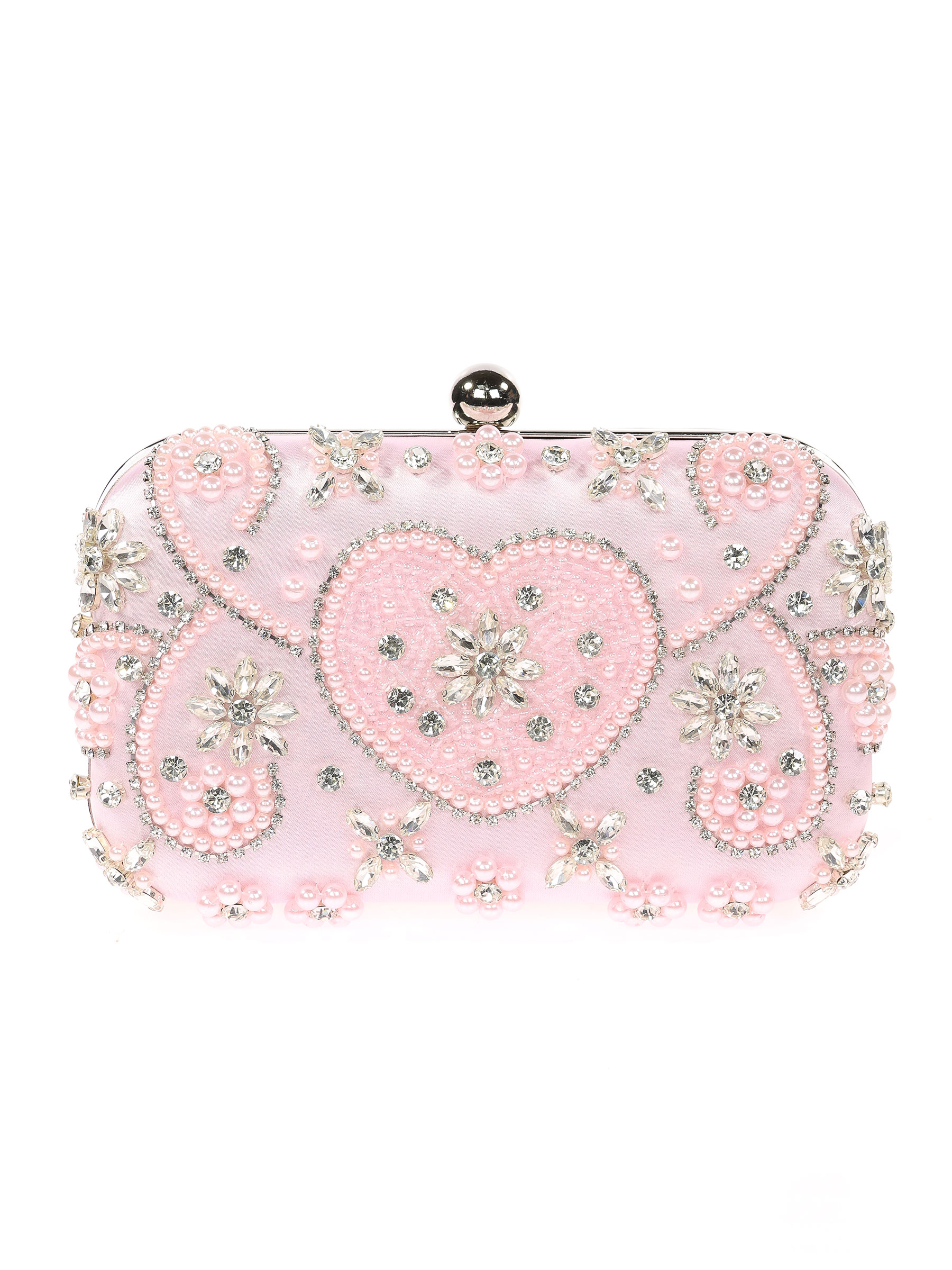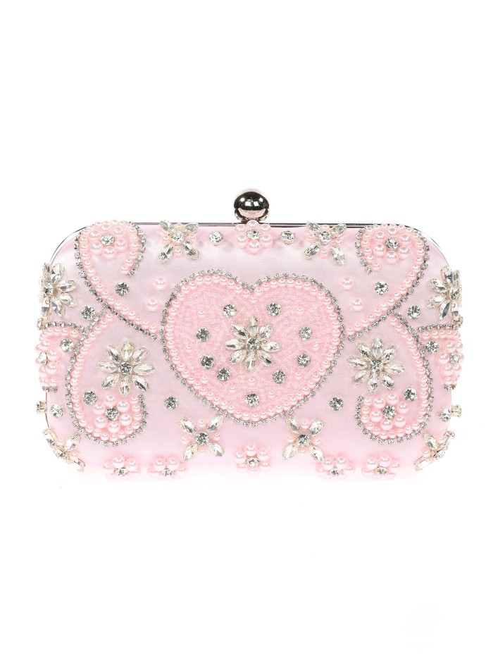 Bolso de fiesta. Material raso. Detalle pedrerías en el frontal. Asa corta de mano en cadena. Asa de hombro en cadena. Forro sin bolsillo interior. Cierre metálico plateado.