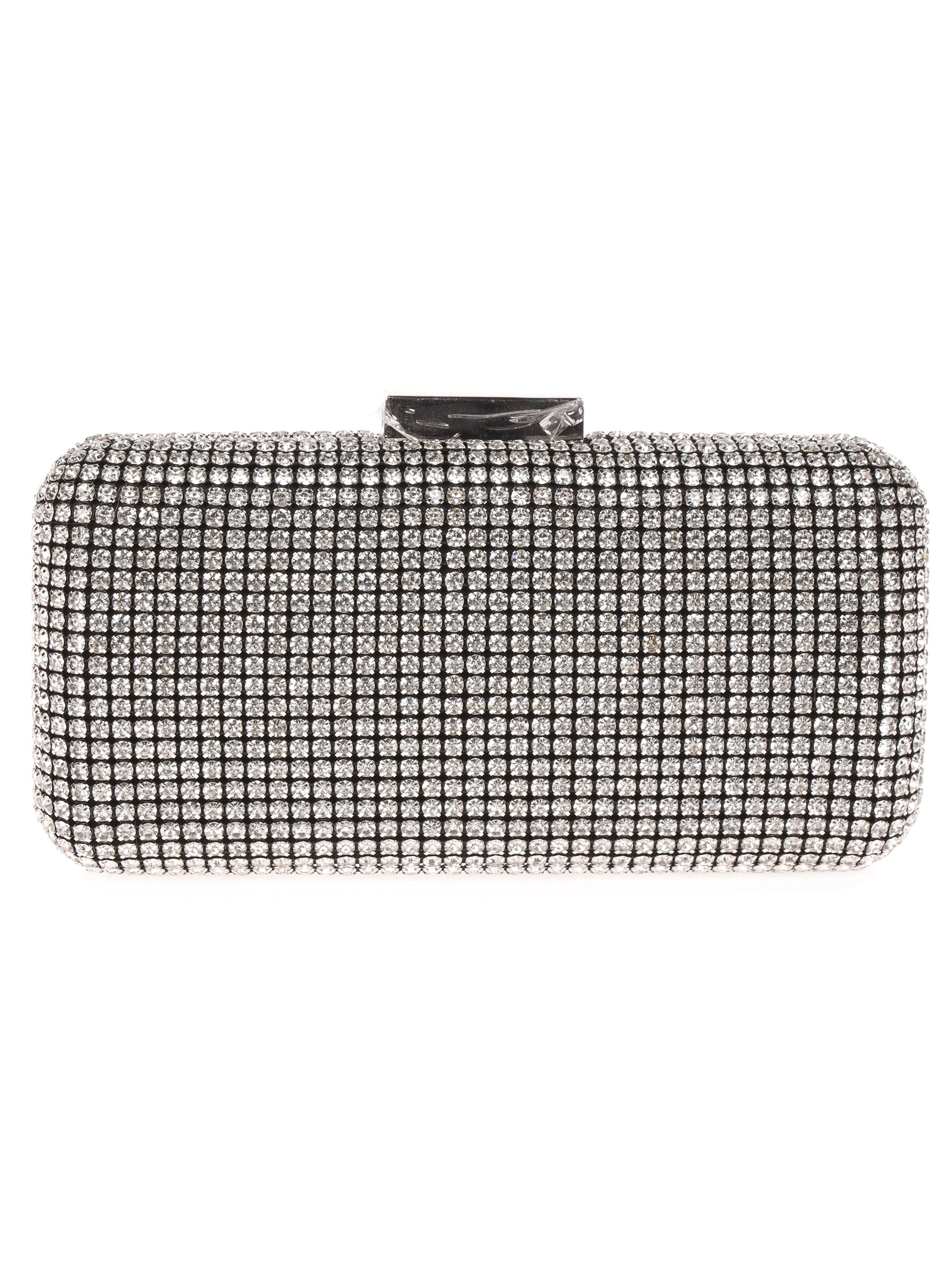 Bolso de fiesta. Material raso. Detalle pedrerías en ambos lados. Asa de hombro en cadena. Forro sin bolsillo interior. Cierre metálico plateado.