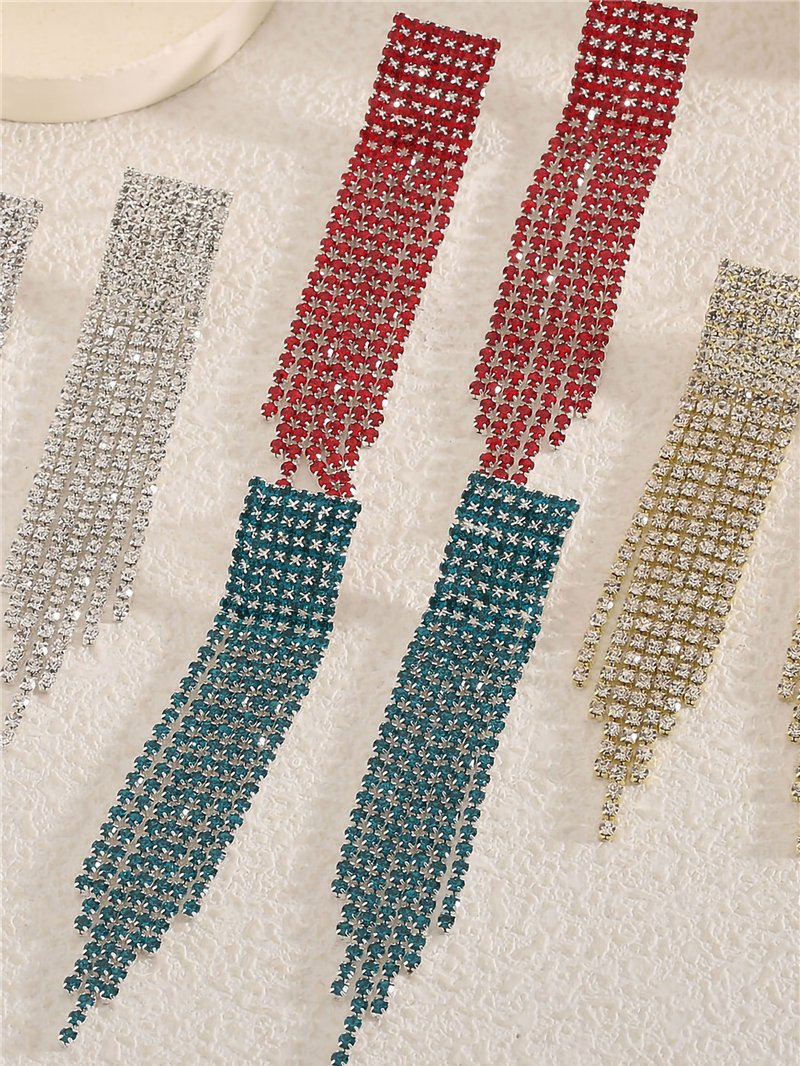 Pendientes largos de acero con flecos de strass en varias hileras.