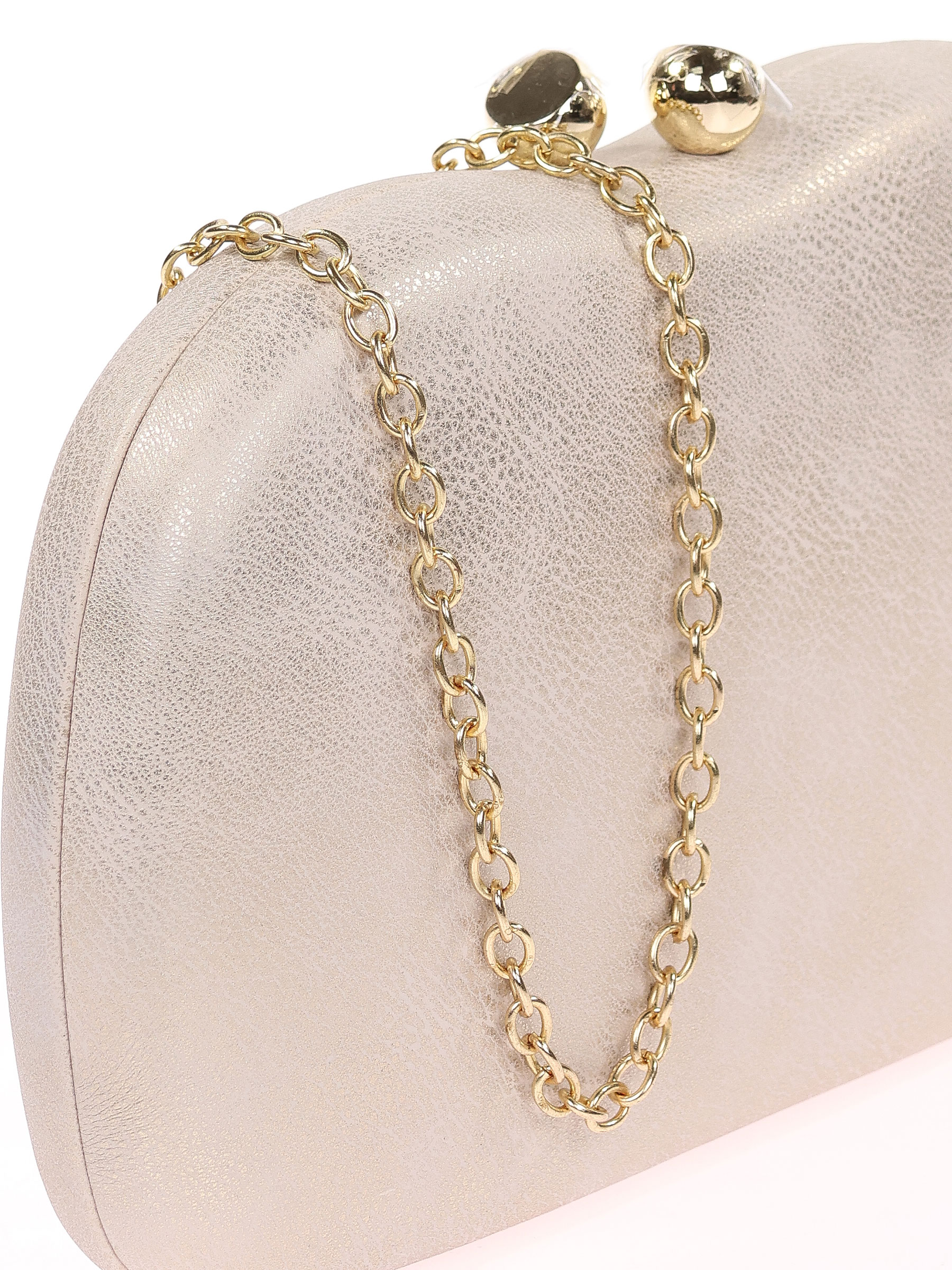 Bolso de fiesta. Material polipiel. Efecto metalizado. Asa de hombro en cadena. Forro sin bolsillo interior. Cierre mediante imán.