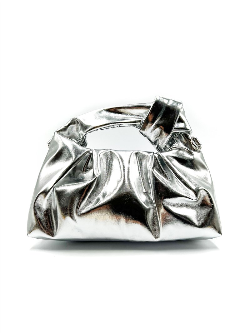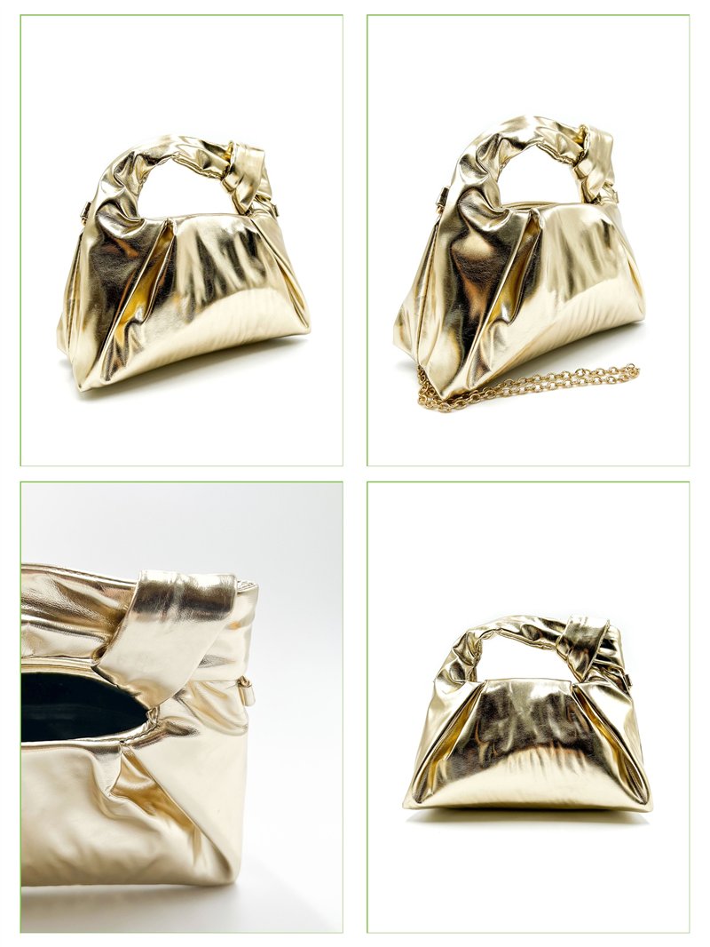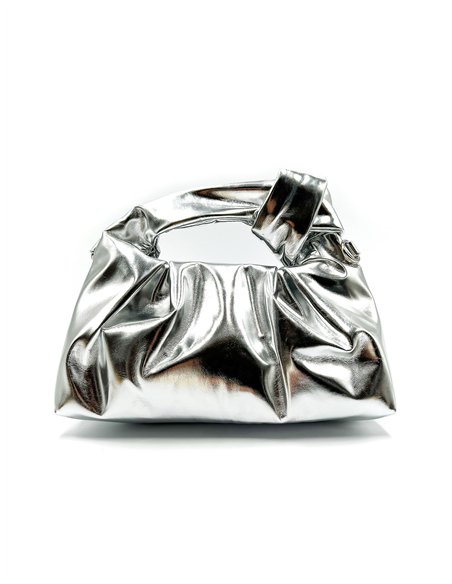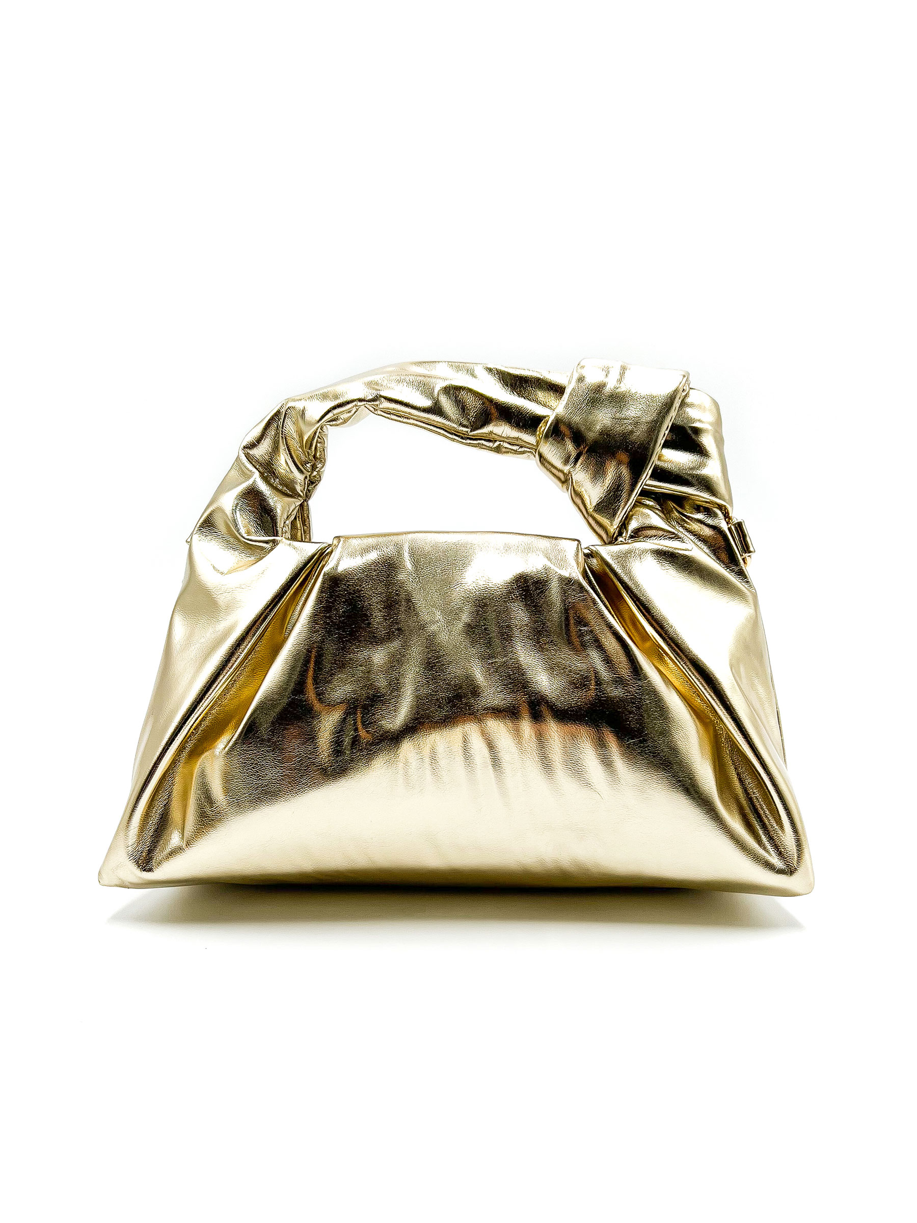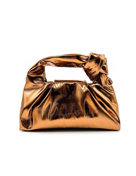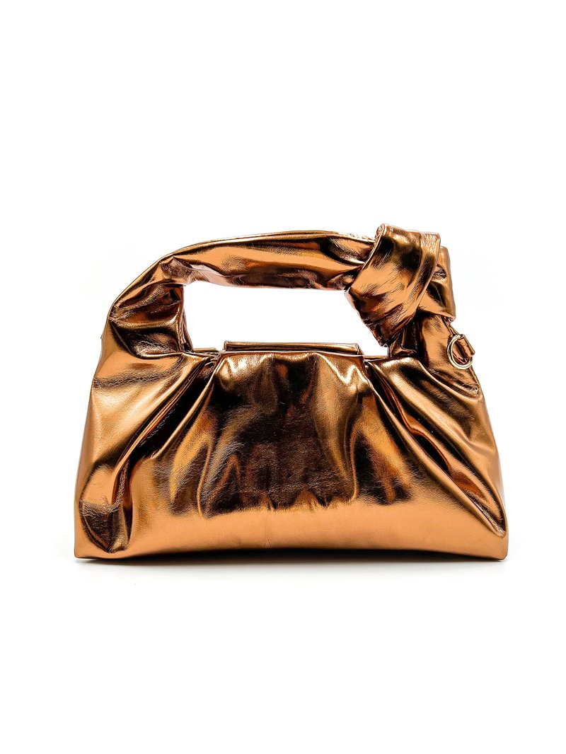 Bolso de fiesta. Acabado metalizado brillante. Asa corta con detalle anudado. Formato rectangular.