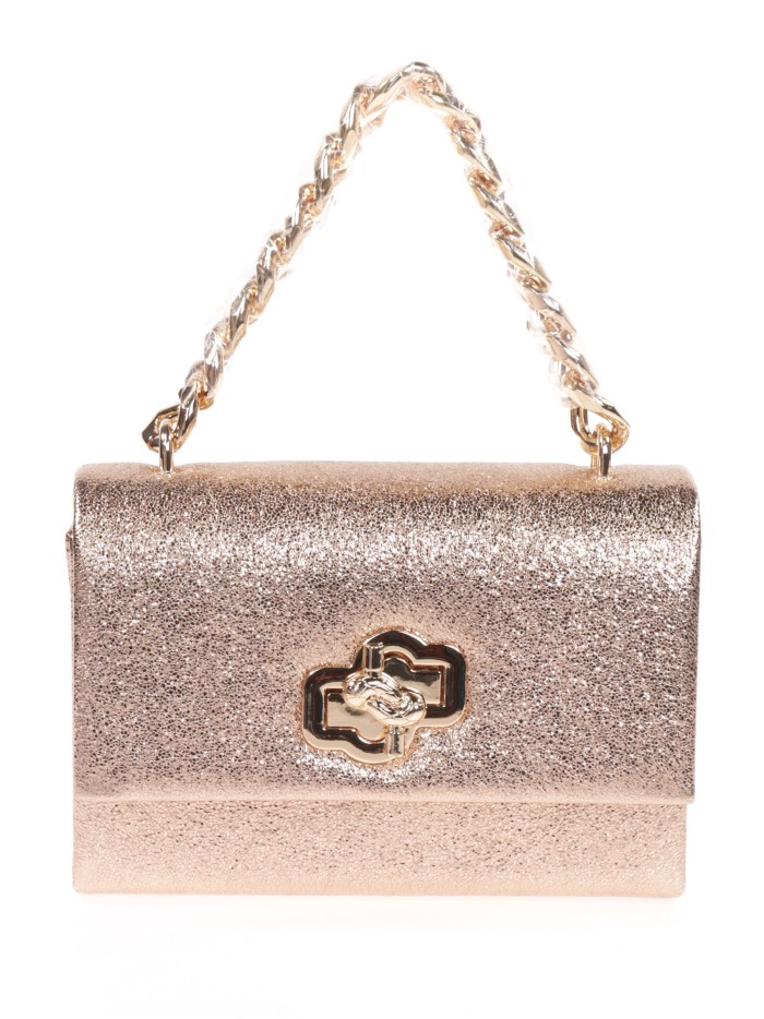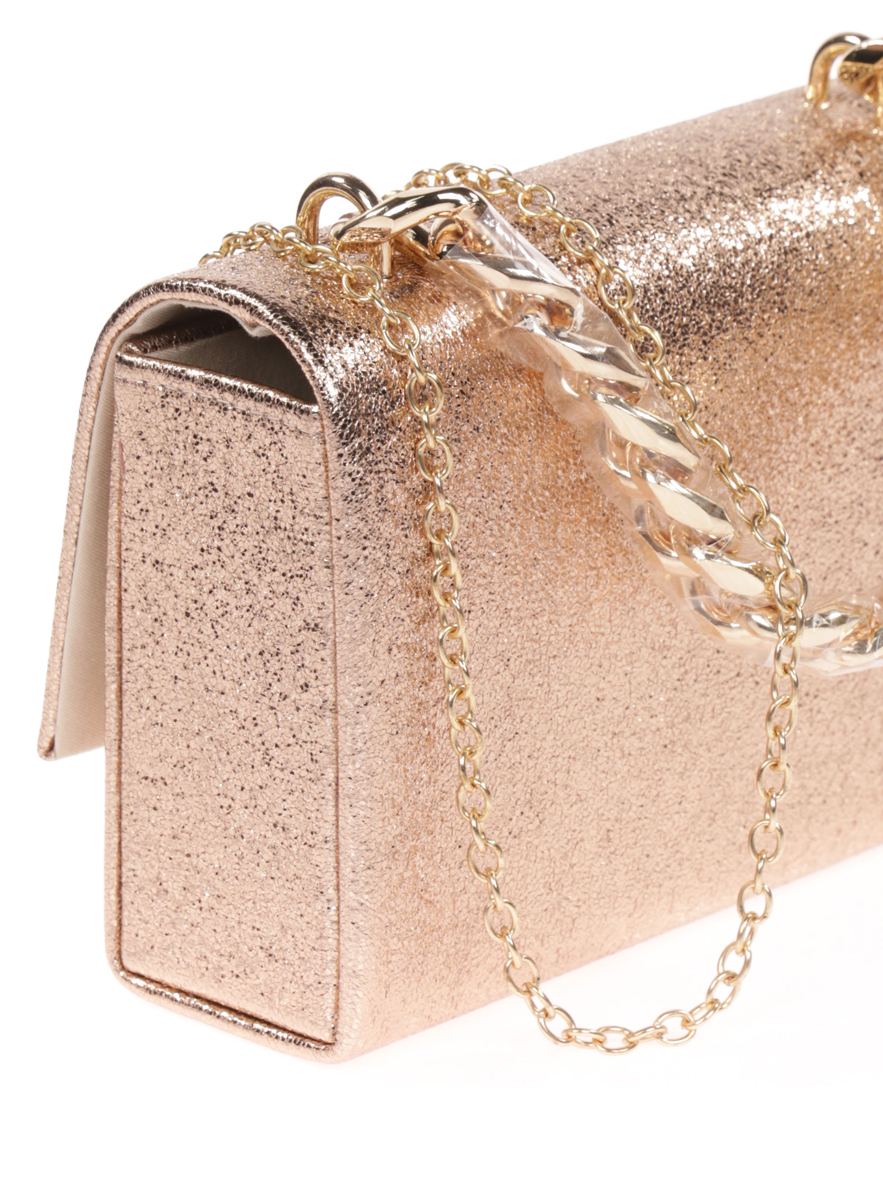 Bolso de fiesta. Material polipiel. Efecto metalizado. Asa de mano. Asa de hombro en cadena. Forro con bolsillo interior. Cierre metálico dorado.